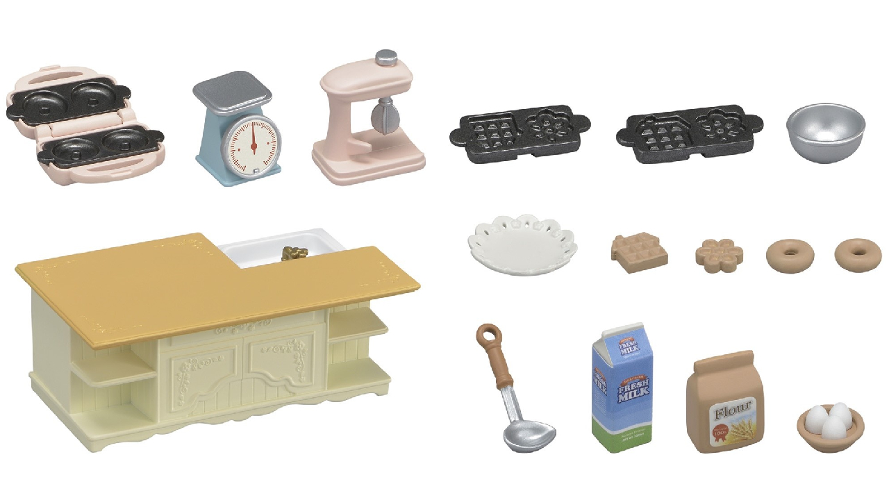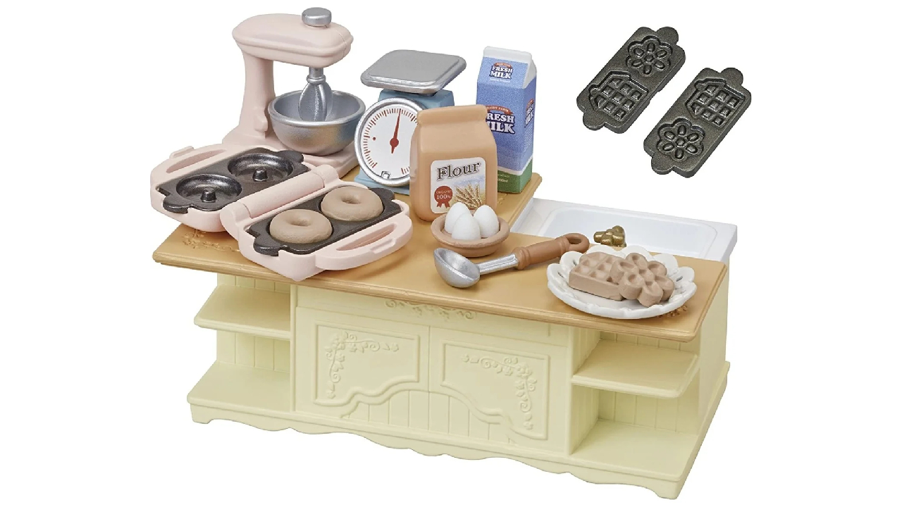 It includes kitchen appliances, each with their own special functions, such as scales that move up and down, a rotary mixer and a waffle and donut maker with interchangeable shapes.