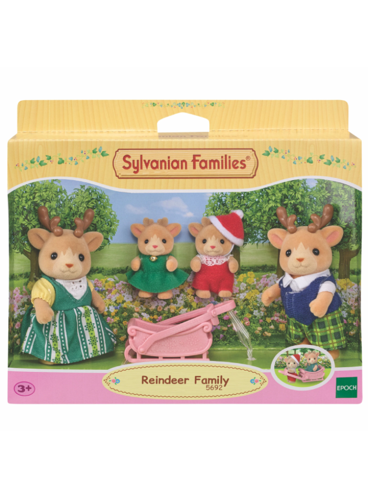 Familia de reni include un tată și o mamă ren cu coarne magnifice, pui de gemeni și o sanie pentru copii.
