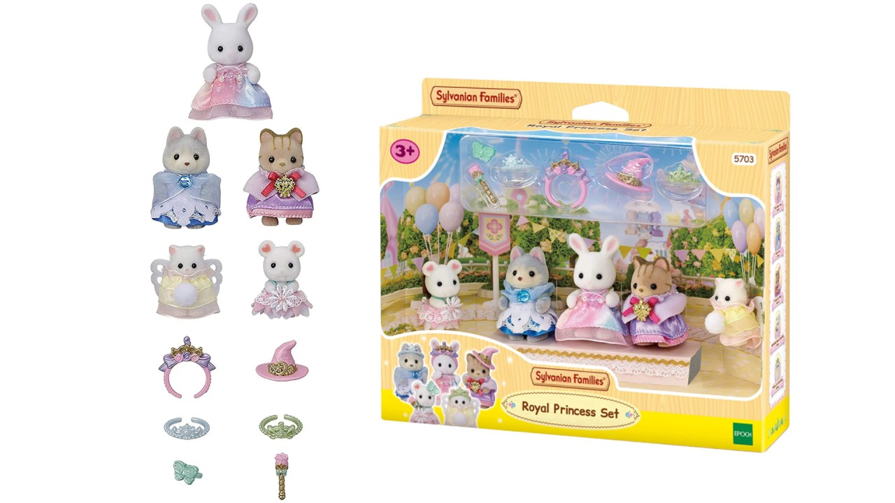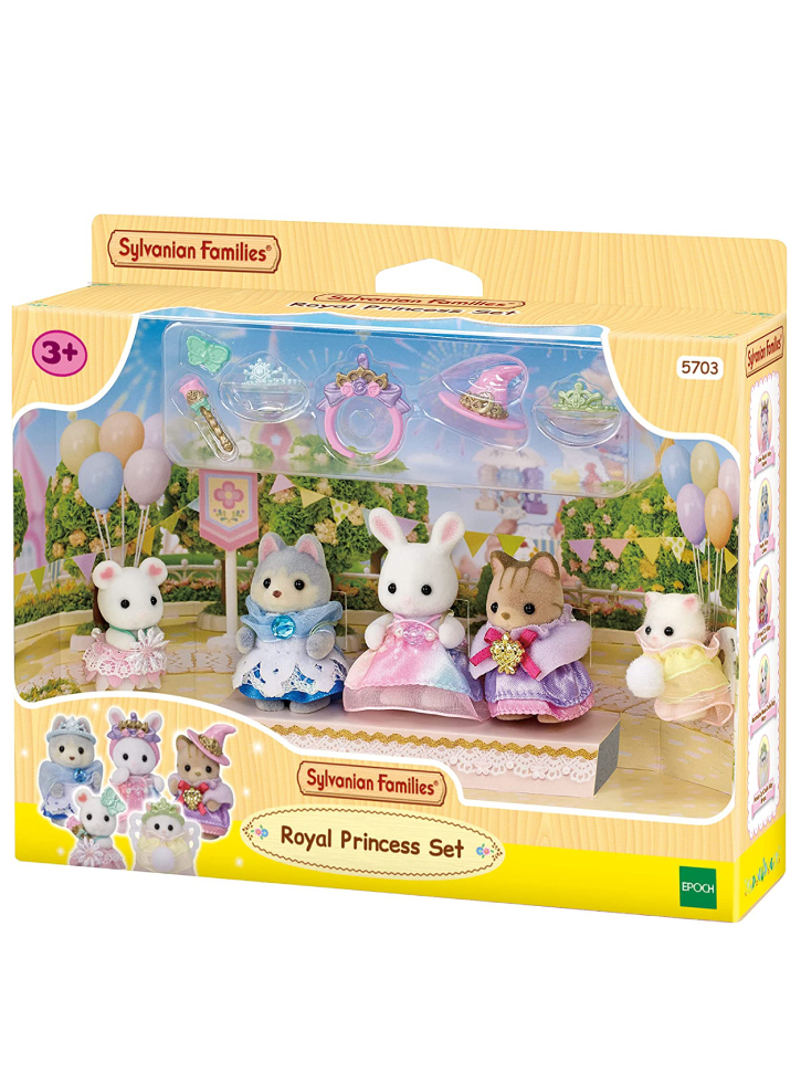 Setul de figurine Sylvanian Families "Prințesă" include un iepuraș de zăpadă, un pui de husky, un pui de pisică tabby, un pui de șoricel de bezea și o pisicuță persană, fiecare cu o rochie fabuloasă.