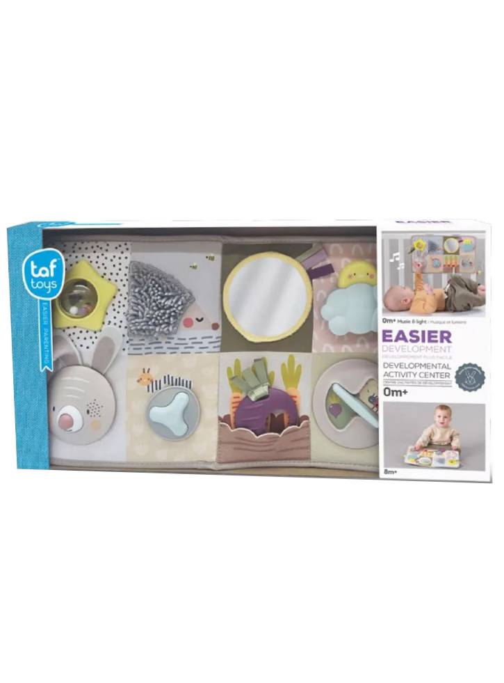 Include 13 activități de dezvoltare pentru joc și explorare reciprocă: iepuraș cu muzică și lumini, activități pick-a-boo, minge transparentă zăngănitoare, Ratchet, panglici colorate, oglindă sigură pentru bebeluși, labirint cu inele colorate și multe altele.