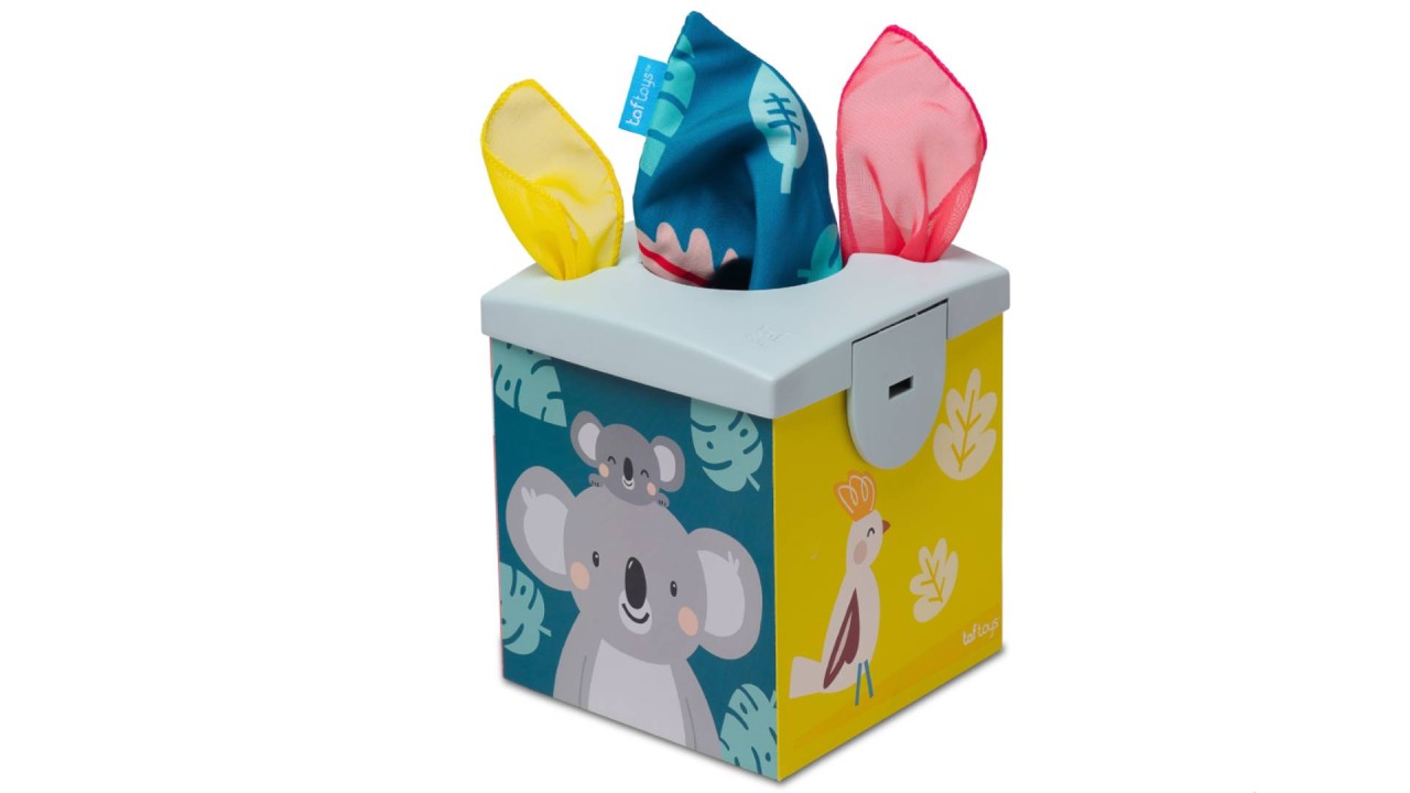Orificiul principal al capacului cutiei este special conceput pentru a se potrivi mâinilor delicate ale bebelușului, în timp ce orificiile laterale imită senzația de tragere a șervețelelor umede, un joc pe care toți bebelușii îl adoră!