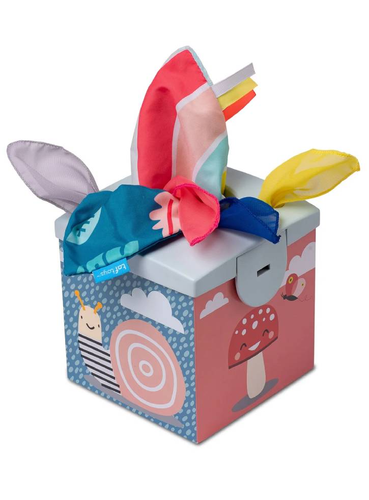Promovează jocul senzorial cu texturi și sunete, recunoașterea culorilor. Cutia de șervețele senzoriale Taf Toys pentru bebeluși și copii mici conține 8 țesături organza colorate de înaltă calitate și 2 hăinuțe încrețite cu partea din spate pufoasă și panglici colorate.