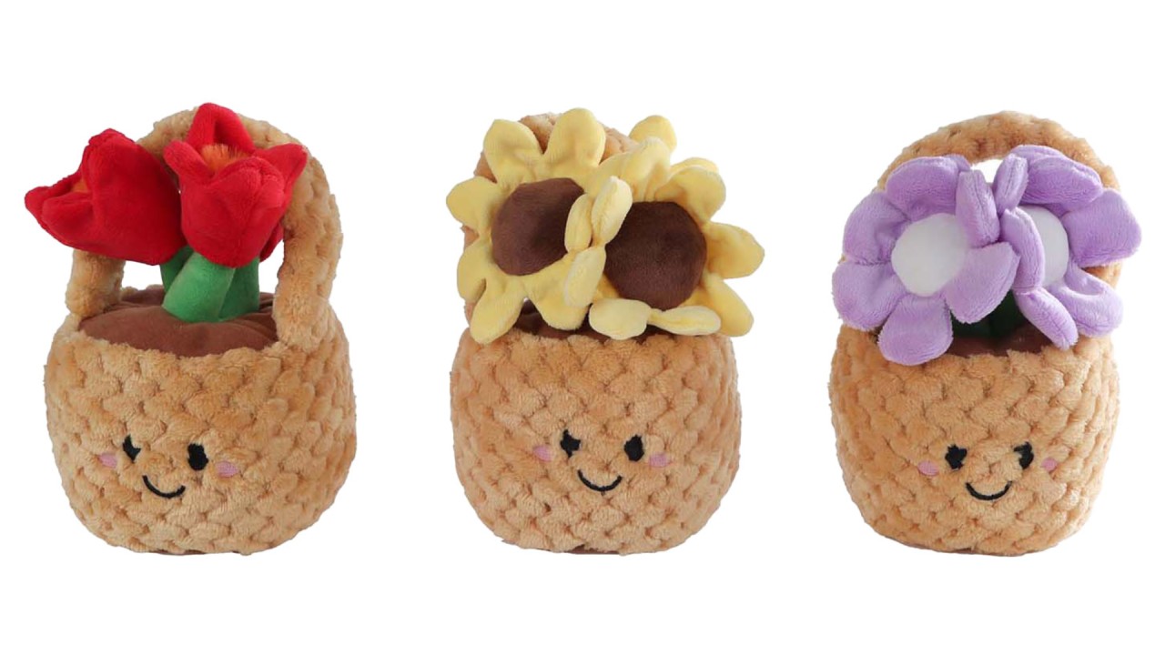 Acest coș cu flori de pluș are flori moi, ușor de îmbrățișat, aranjate frumos într-un coș frumos din material textil.