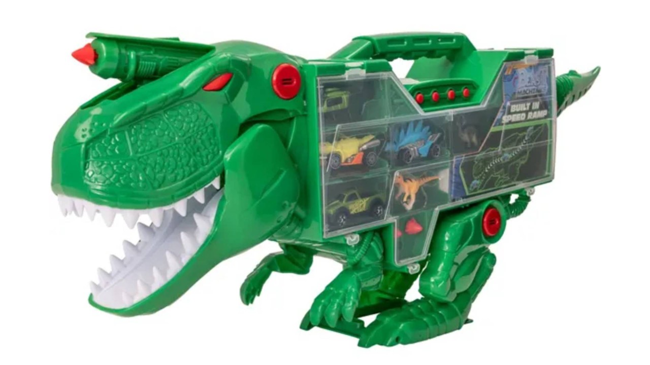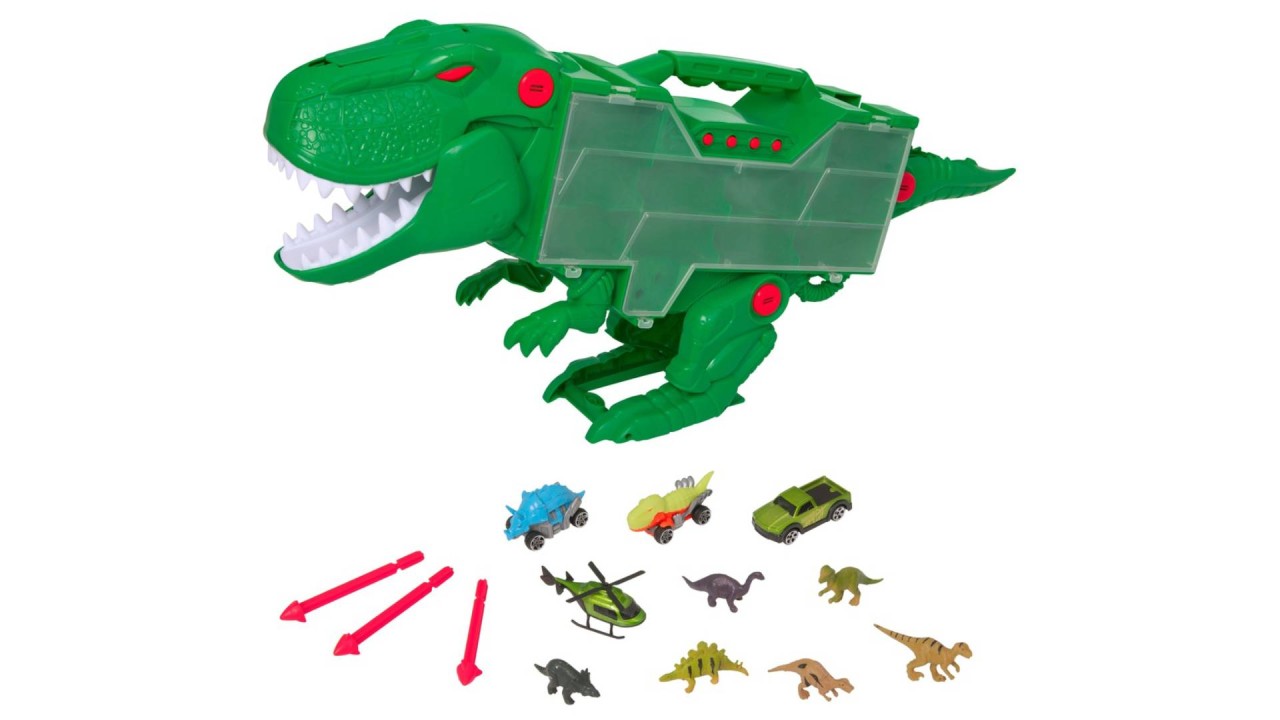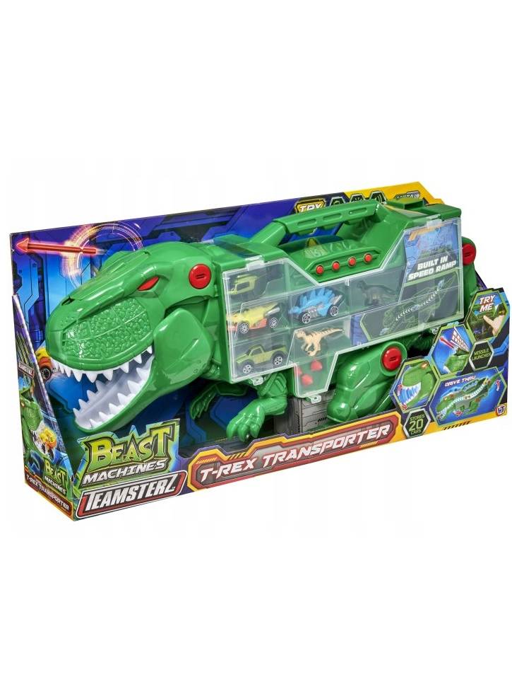 Transportorul Teamsterz T-Rex include 2 mașini Beast Machines, 2 vehicule, 6 figurine de dinozaur și 3 rachete.