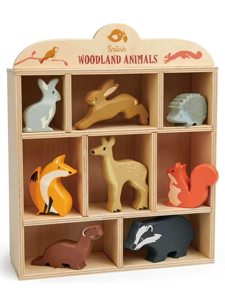 Tender Leaf Display Shelf with 8 Wooden Animals Woodlands este un set adorabil se dublează ca jucărie și decor pentru camera de joacă.