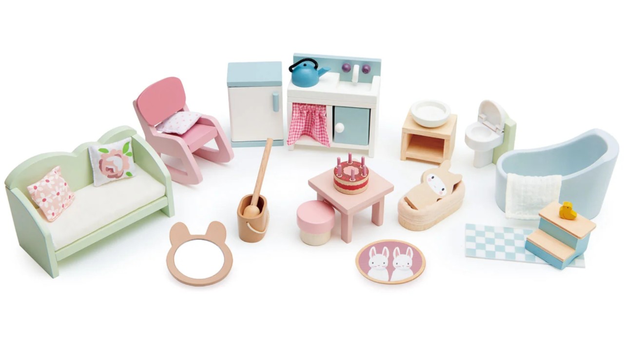 Setul din lemn de cea mai înaltă calitate se mândrește cu un adevărat design britanic în culori delicate, dar bogate, care vor crea o atmosferă fantastică plină de distracție atunci când te joci de-a designerul de interior.