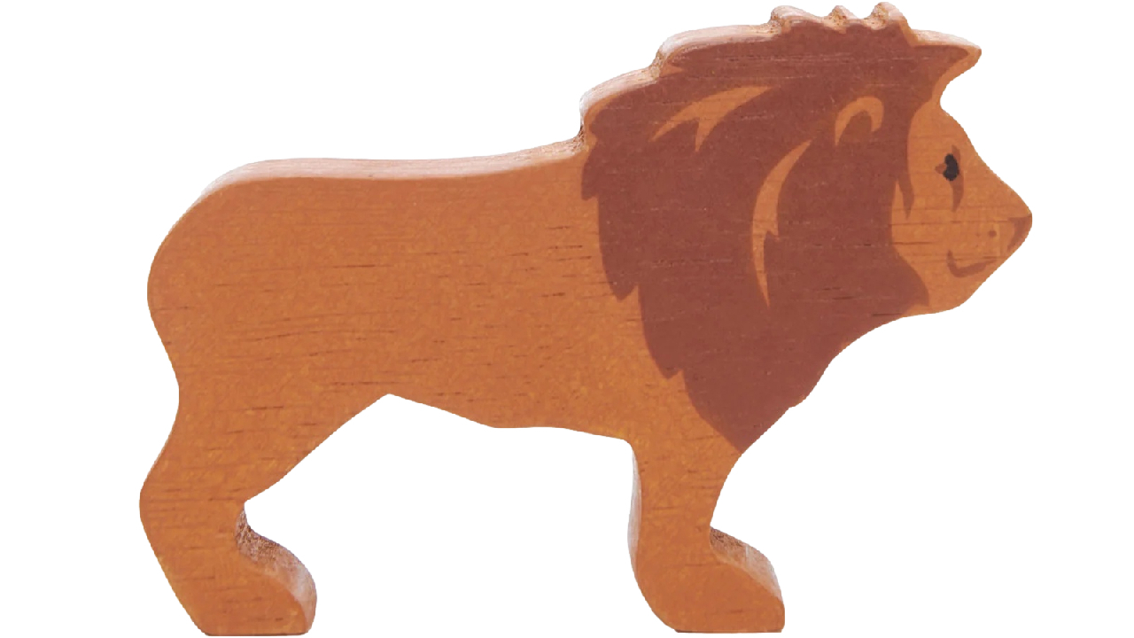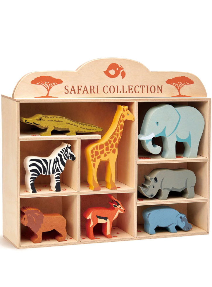 Perfectă pentru mânuțele mici, această colecție de animale superbe de safari este prezentată într-un raft din lemn cu compartimente.
