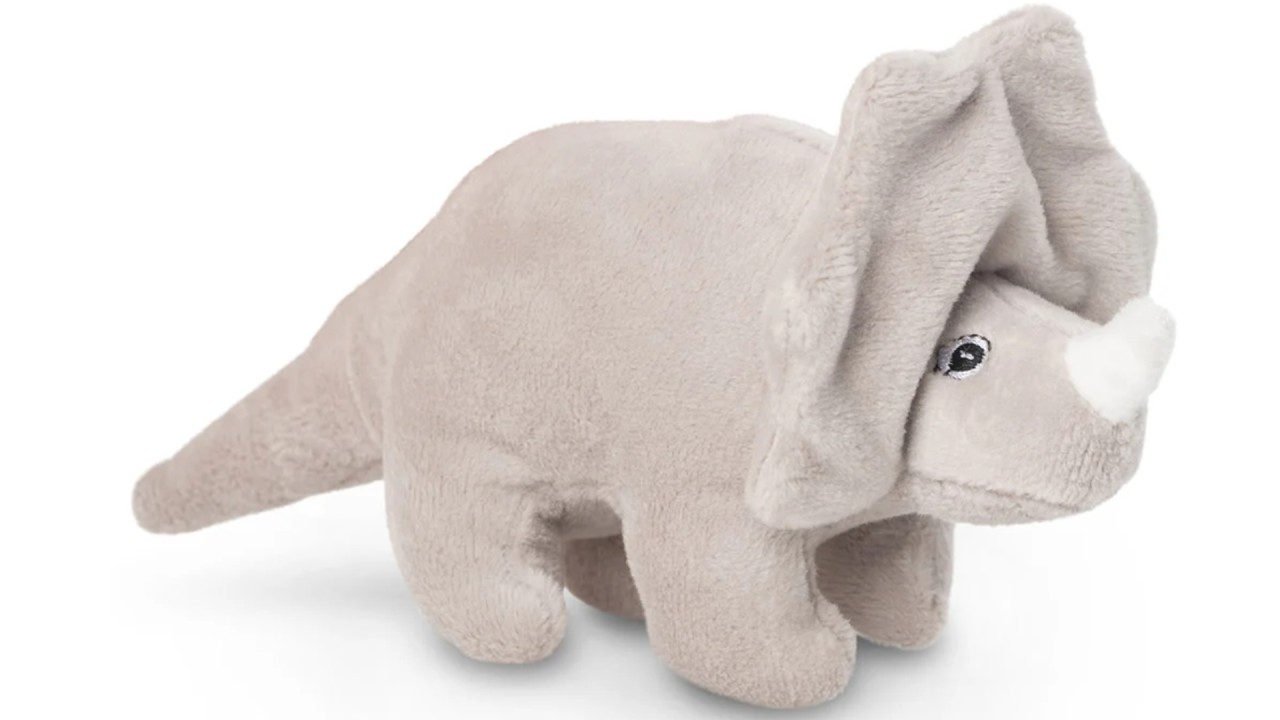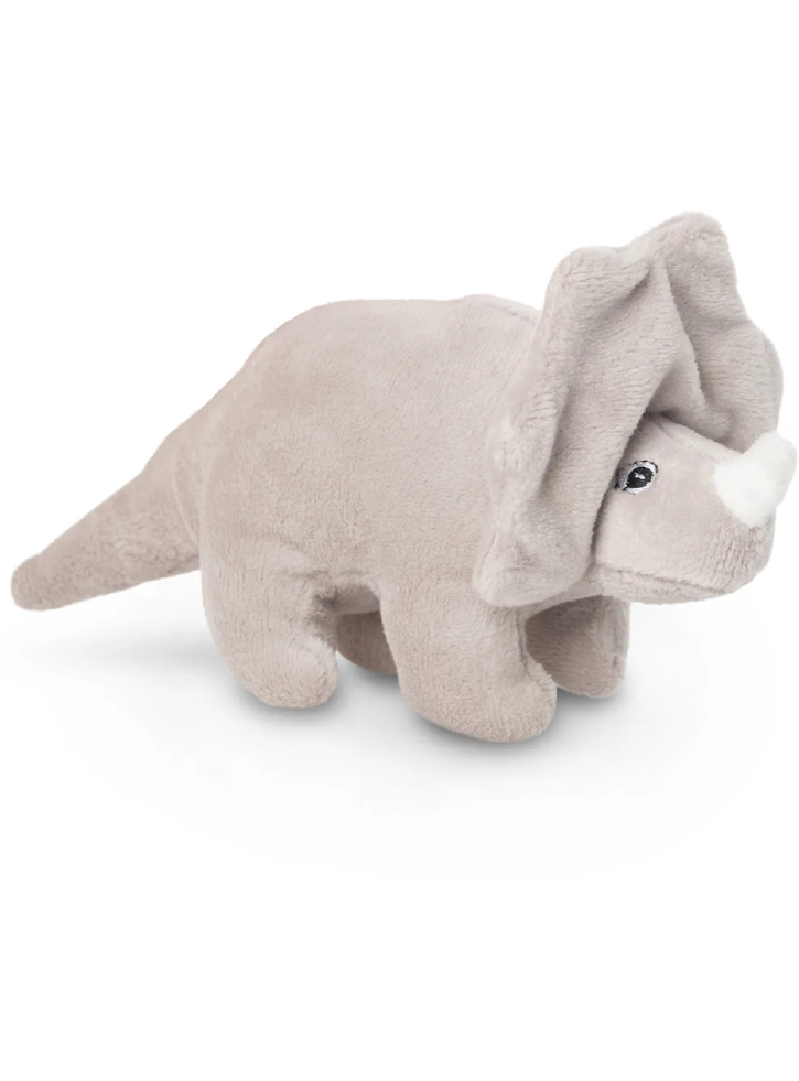 This cute That's Mine rattle is designed as a gray dinosaur.