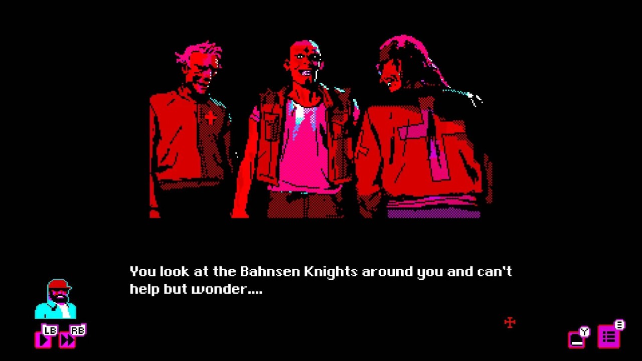 Bahnsen Knights Într-o lume a fanatismului religios, a tornadelor F5 și a Ford Sierras, tu ești Boulder, un agent sub acoperire. Sarcina ta este să te infiltrezi în Cavalerii Bahnsen, un cult letal, supraîncărcat, cu un lider enigmatic.