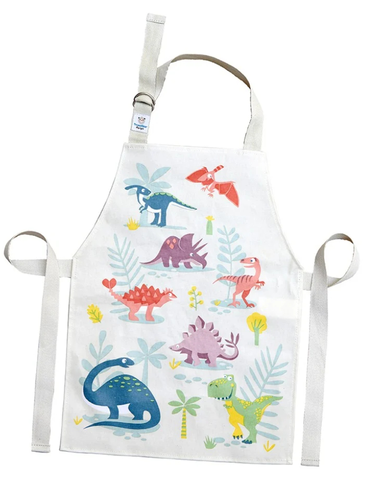 Șorțul este ilustrat cu prietenii dinozauri fabuloși, iar legăturile sunt realizate din bumbac puternic cusut dublu și este reglabile la gât cu inele D metalice.