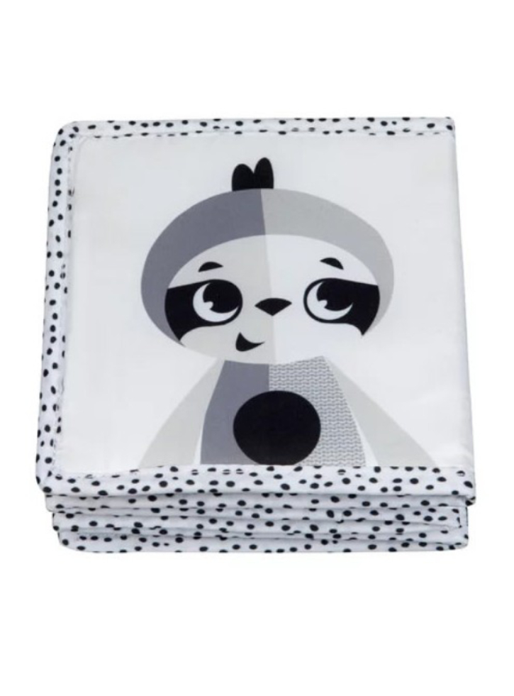 Această carte pentru bebeluși cu două fețe, cu o față în alb-negru și cealaltă în culori neutre liniștitoare, poate fi atașată comod la cărucior și stimulează dezvoltarea bebelușului.