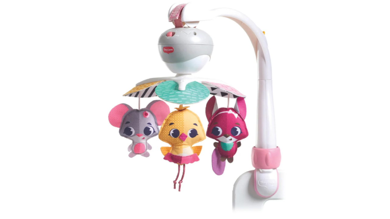 Mobilul muzical Tiny Love se poate roti și poate reda 5 melodii care rulează continuu timp de 30 de minute.