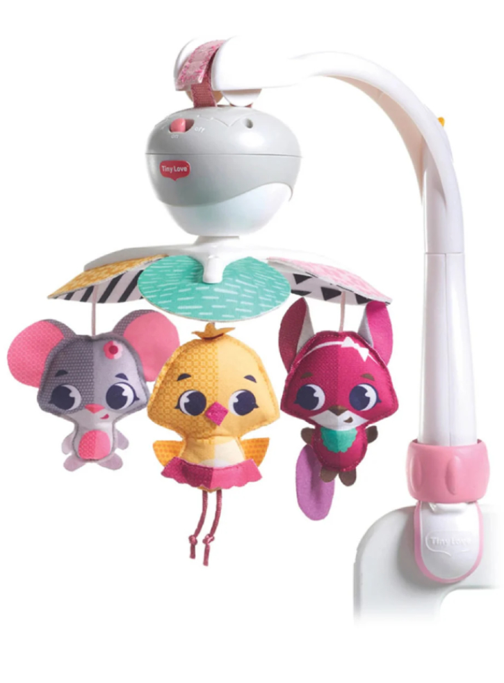 Tiny love musical mobile can rotate and play 5 songs that run continuously for 30 minutes.