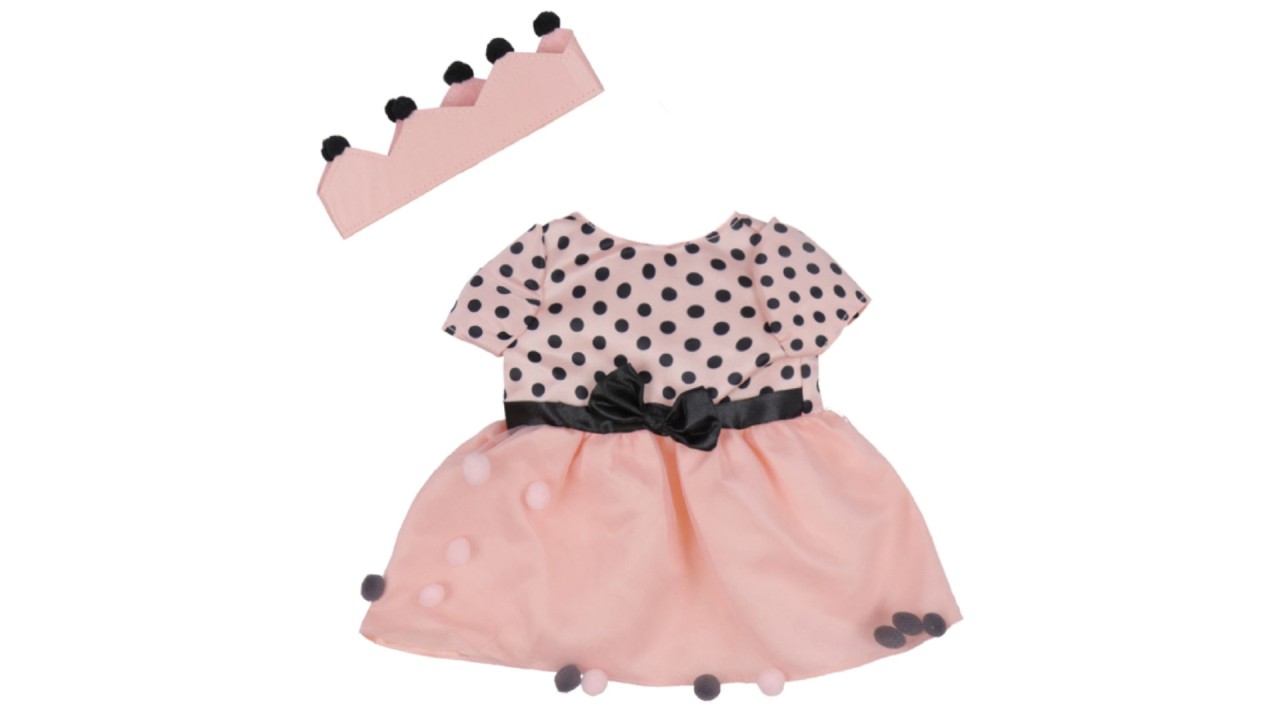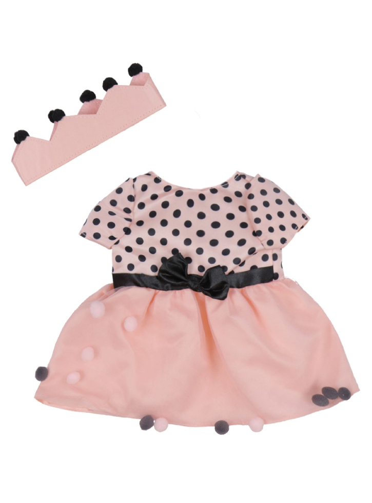 Haine frumoase pentru păpuși Tiny Treasures sub forma unei coroane roz cu pompoane negre în partea de sus și o rochie roz cu puncte negre pe corset și o fundă neagră în jurul taliei.