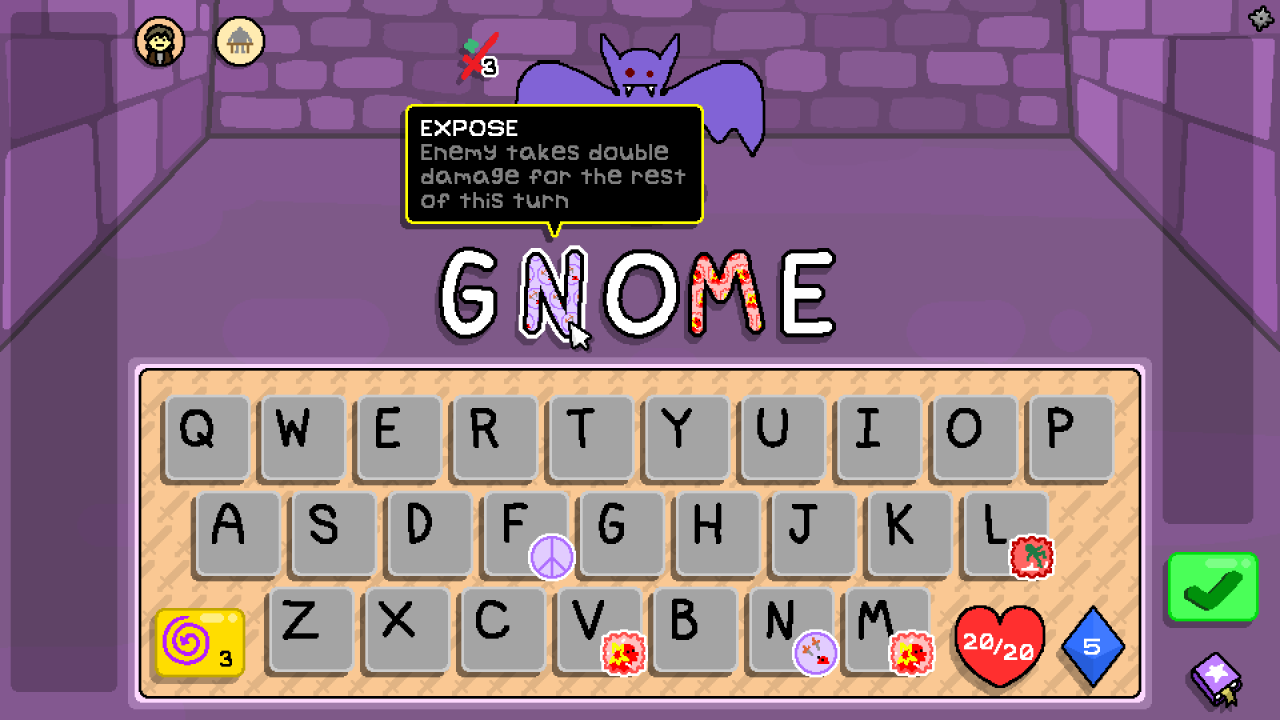 Enter a floor and your letters hum with Magicks. Create tactical combinations by mixing Magicks that should probably never interact. They obey peculiar rules, and mastering them is half the fun. One might strike harder if placed at the end of a word, another might heal you, and a third might hurt you simply for using too many vowels. The most cursed can become your greatest weapon… if you’re clever or desperate enough.