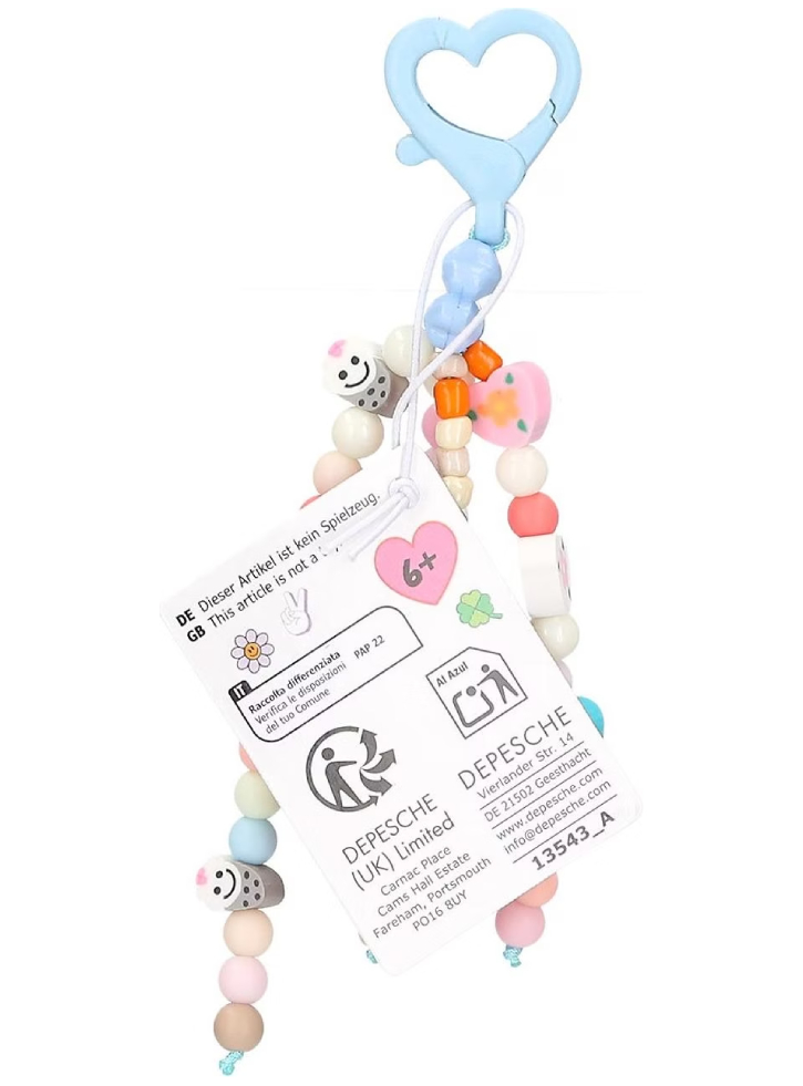 With its playful design and colored beads, this key ring is perfect for customizing articles such as backpacks or bags.