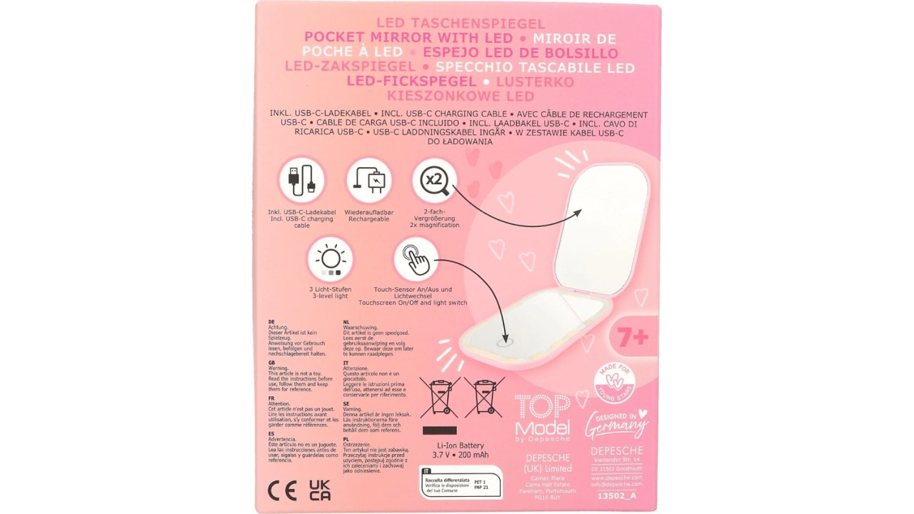 TOPModel pocket mirror with magnifying function and beauty light perfect for travel.