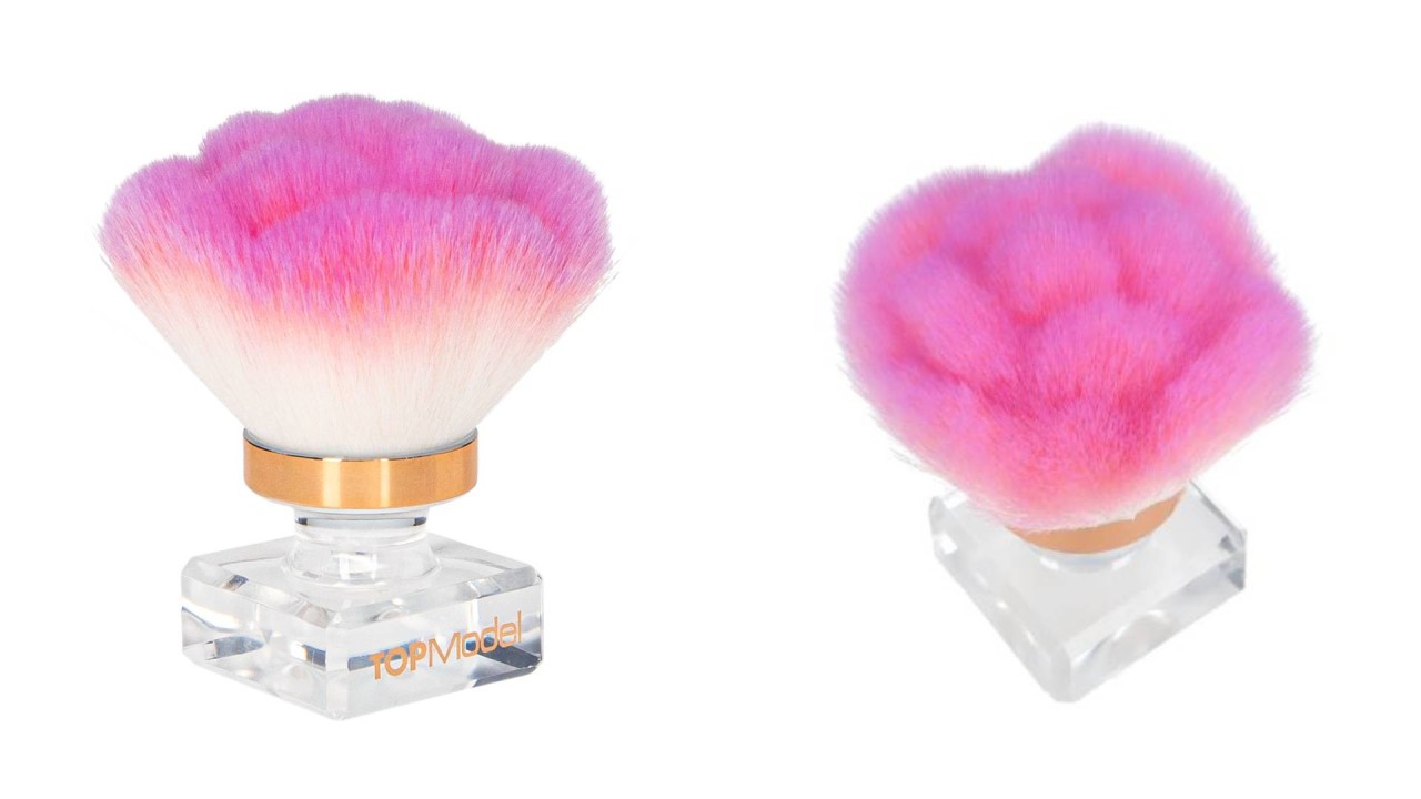 Aceasta pensula de frumusețe ultramoale de la TOPModel are un mâner pătrat în aspect de cristal, cu o margine aurie roz și logo imprimat.