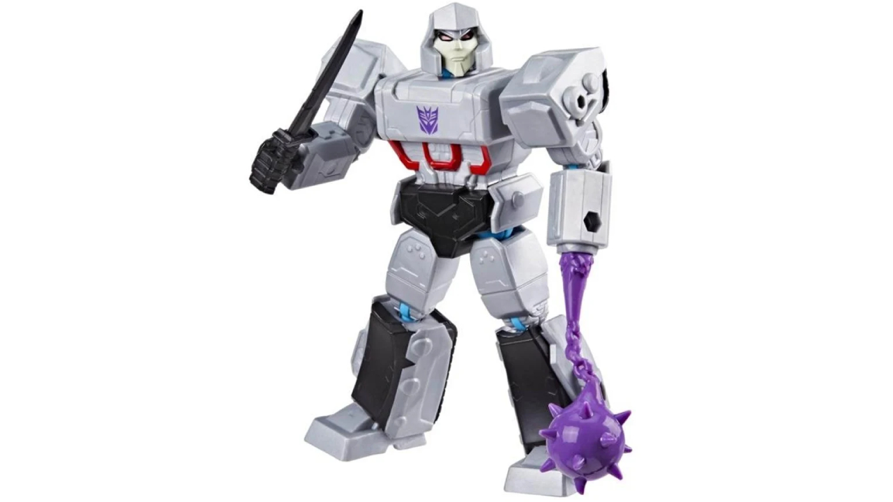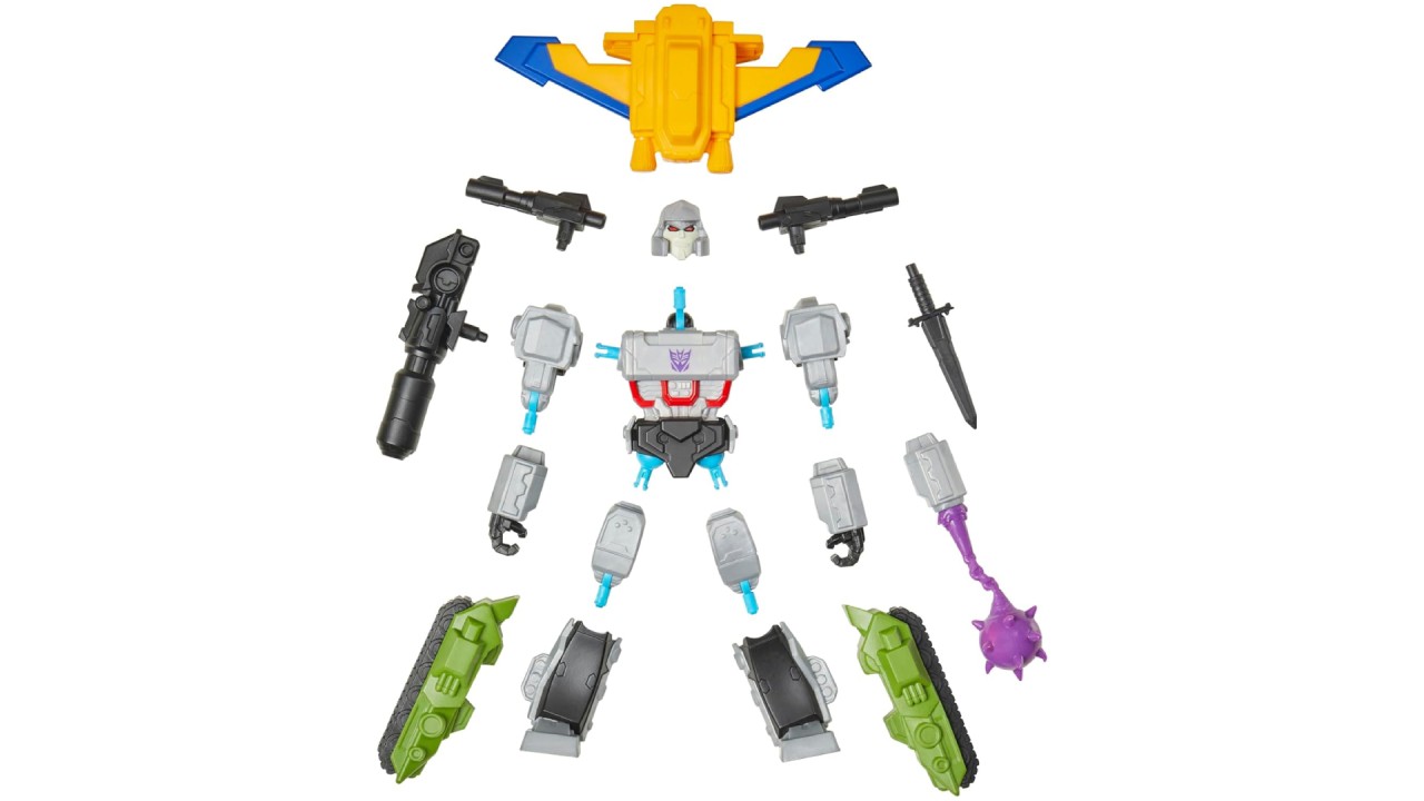 The MEGATRON Robot Robot Figurine comes with an Optimus Prime Orange and Blue Jetpack and 2 Black Blasters, plus 4 accessories, including a bent purple buzz.