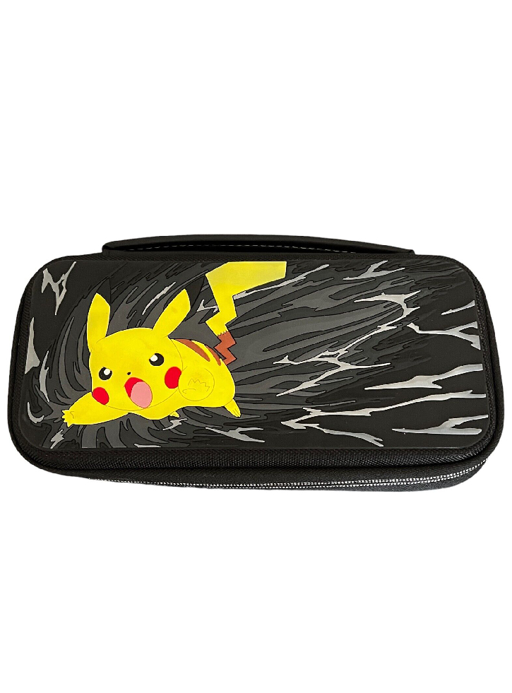 Geanta de călătorie pentru consolă are un mâner Comfort Grip pentru o transportare ușoară și un design dinamic 3D sculptat în tonuri de gri cu Pikachu în mijlocul atacului.