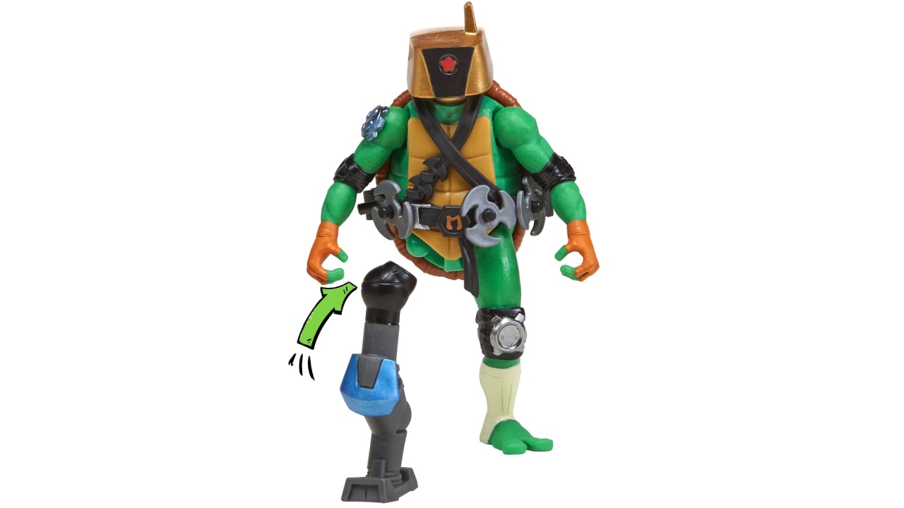 Figurina Michelangelo Mix N Match include capul lui Mechazoid, brațul drept al lui Bishop și armele iconice ale lui Mike pentru o personalizare nesfârșită.