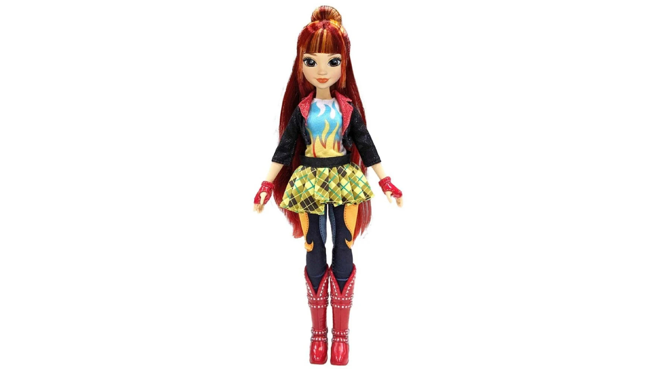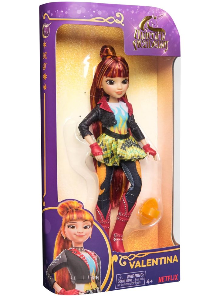 Periați părul aprins evidențiat al Valentinei si descoperiți hainele ei de păpușă, jachetă neagră, fustă în carouri si pantaloni de călărie cu unicornul ei, marcajele magice ale lui Cinder; cizme cu crampoane si multe altele.