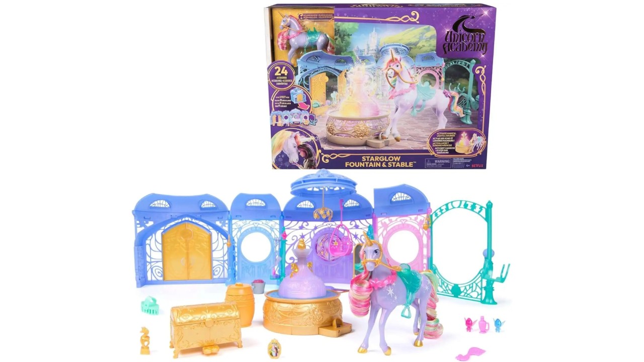 Recreate the magic of Unicorn Academy with the Starglow Fountain and Stable, inspired by the NETFLIX animated series and the bestselling book series where friendship reigns supreme, this playset will spark imaginative stories.