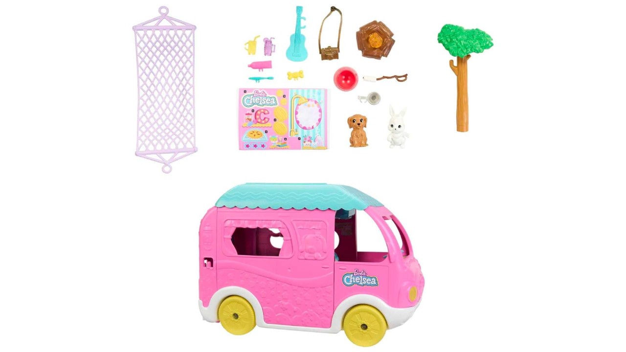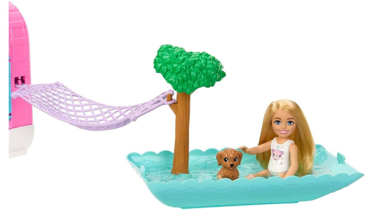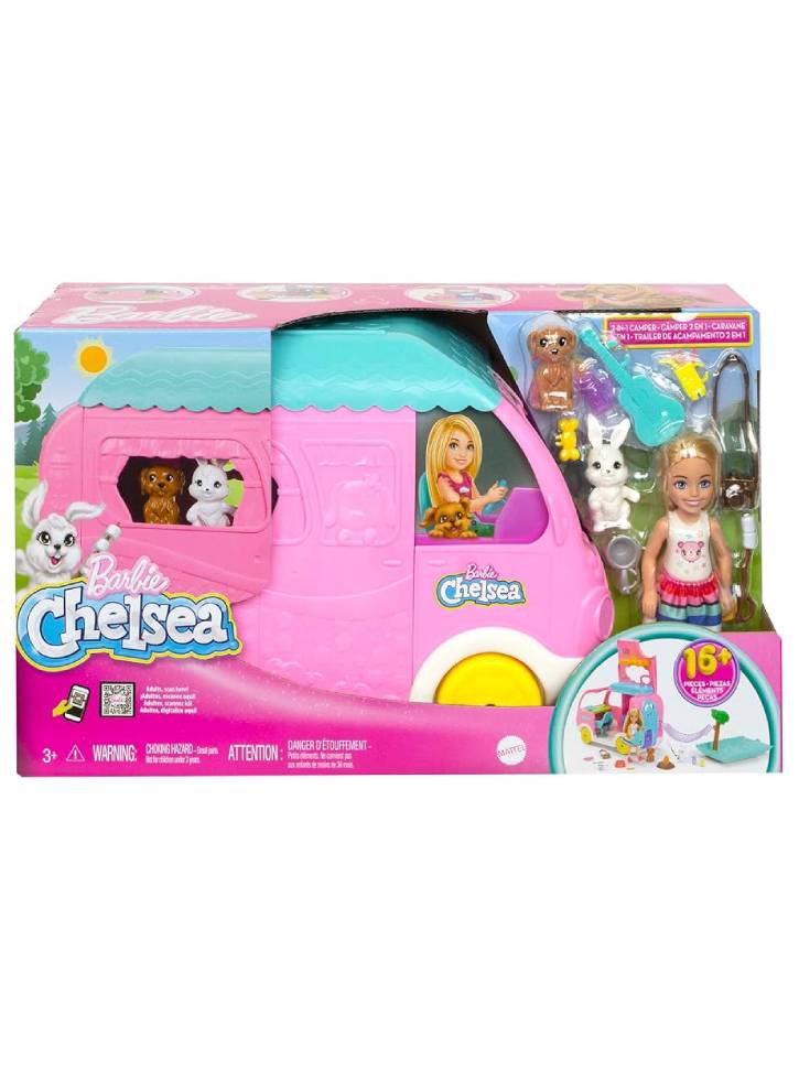 Pornește într-o aventură de camping cu Chelsea și cei doi prieteni de animale ai ei cu setul de joacă Barbie Chelsea 2-in-1 Campervan!