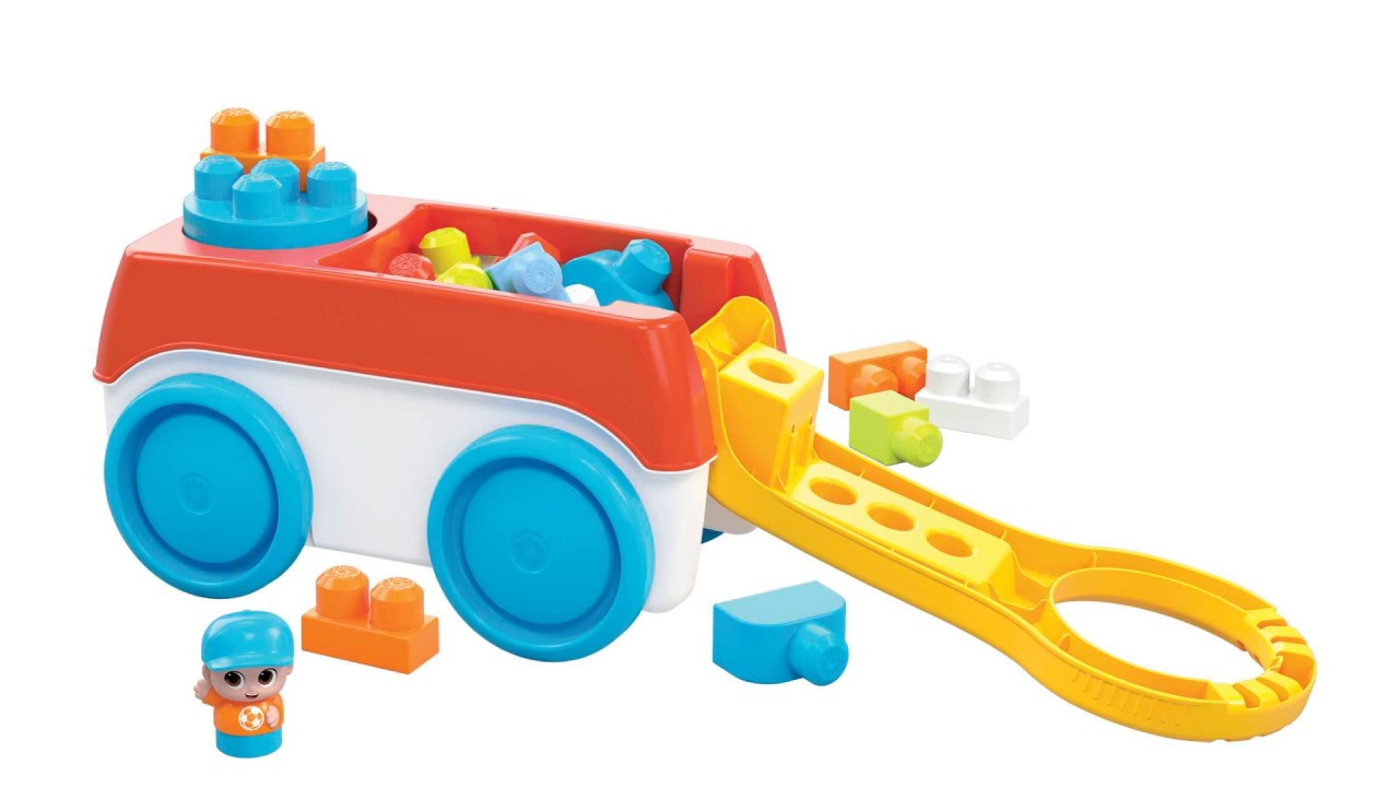 The building set includes 1 spinning cart, 19 large building blocks designed to be durable, and 1 Block Buddies figure.