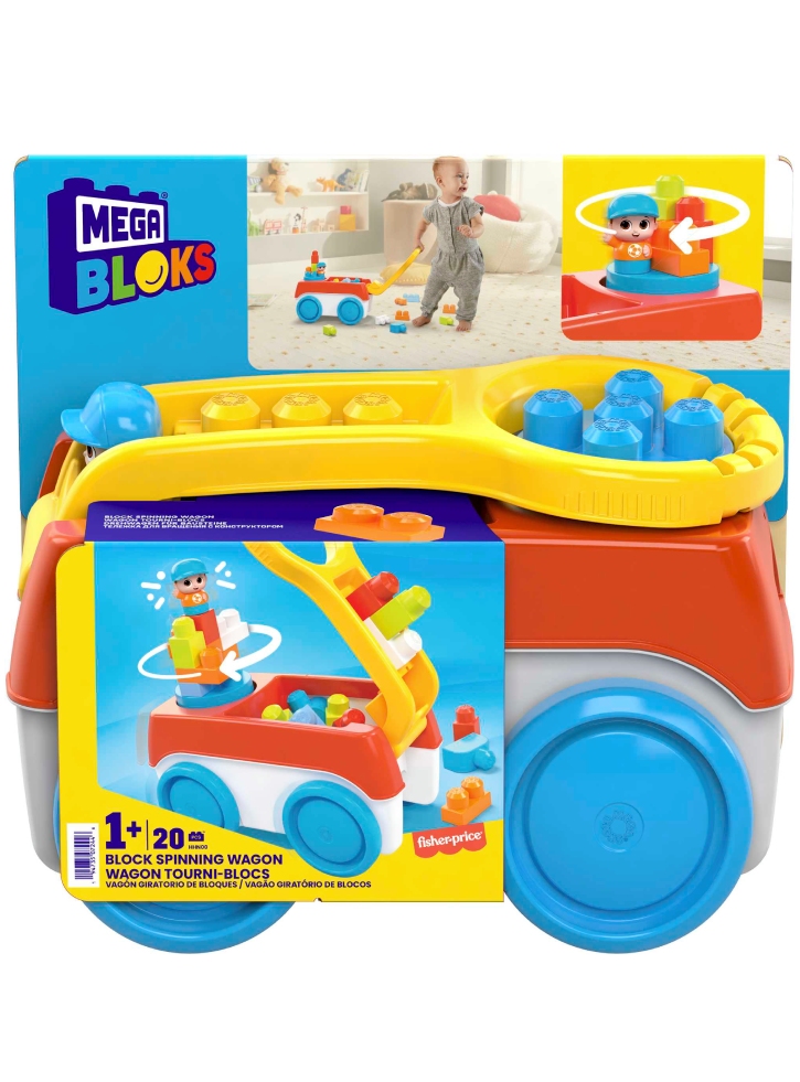 Little ones can spin and roll while playing with the spinning block cart.