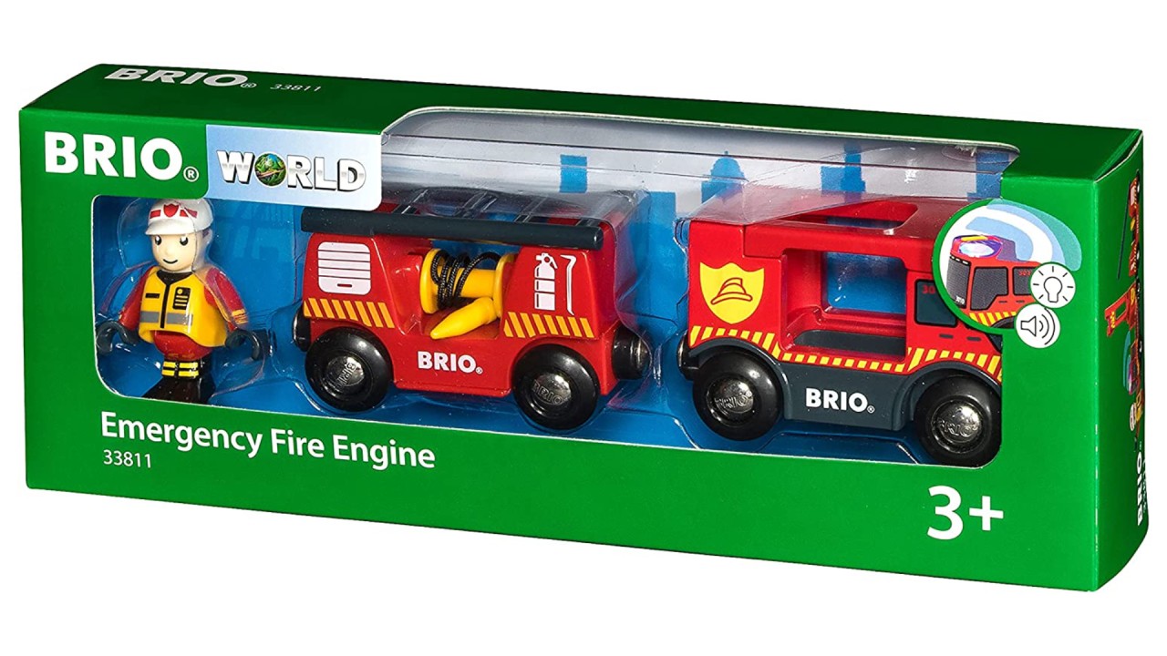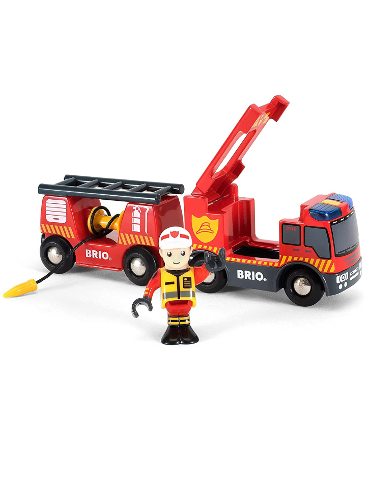 Climb into the fire truck that comes with a hose wagon and press the button for the sirens and lights.