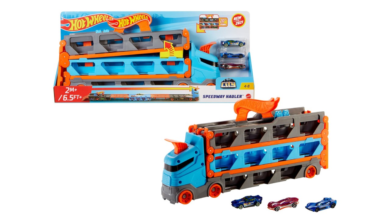 The Hot Wheels® Speedway Hauler™ redefines Hot Wheels® storage and racing in a very cool semi-truck full of surprises.