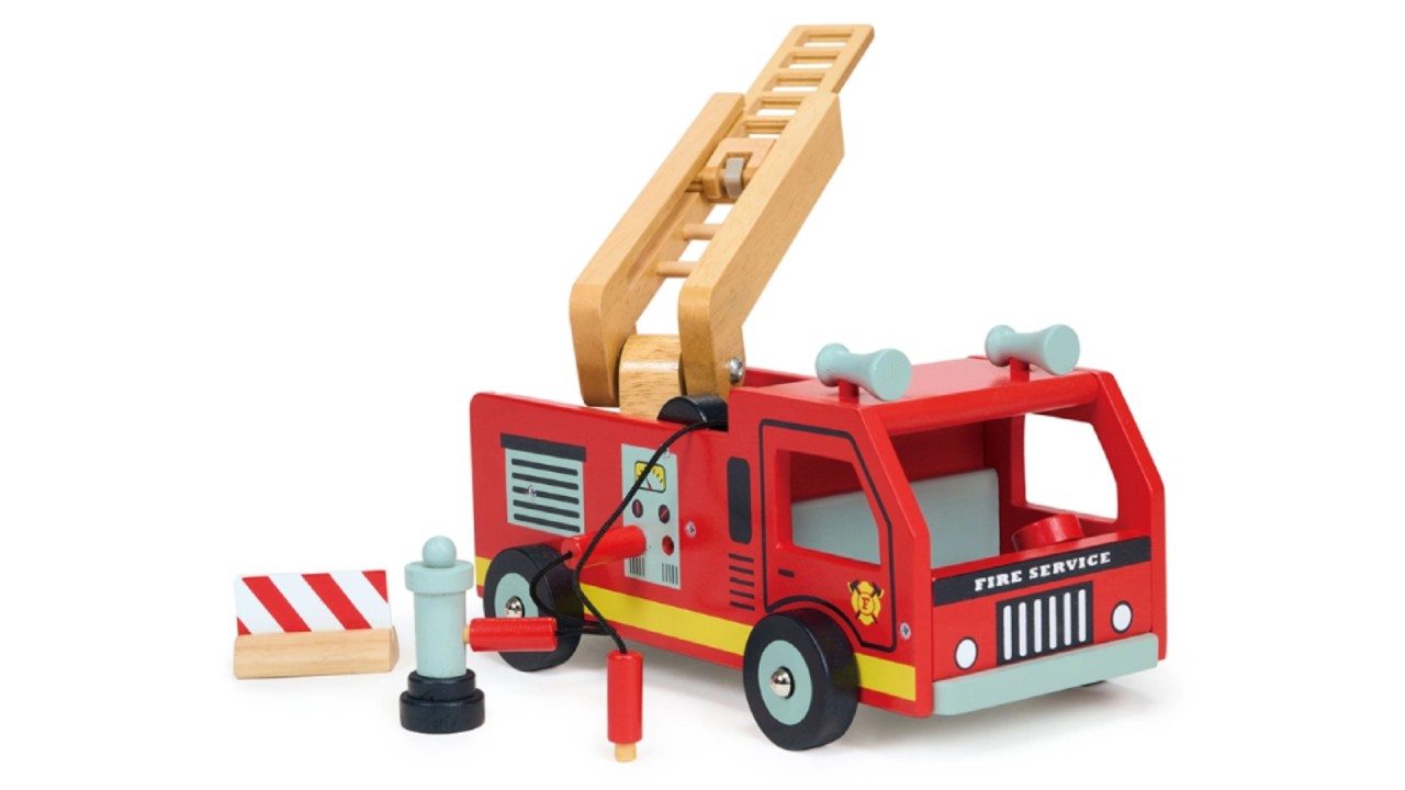Această mașină de pompieri din lemn oferă o experiență distractivă și interactivă, fiind echipată cu o scară extensibilă din lemn natural, un mecanism de înfășurare pentru cablul furtunului și o barieră de urgență.