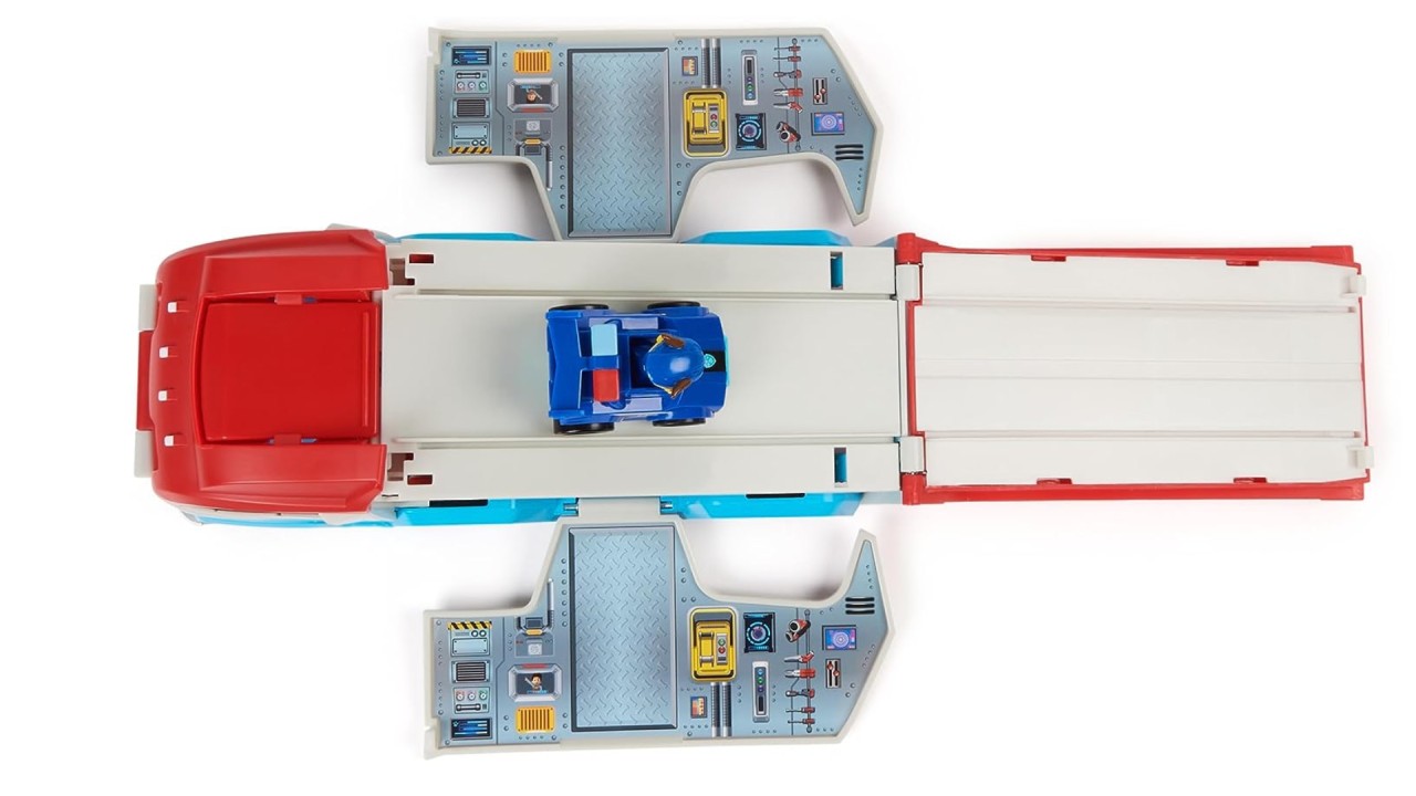 Puneți-l pe Chase pe cabină și activați transformarea care deschide acoperișul remorcii. pentru a o transforma într-o rampă de lansare și coborâți pereții laterali pentru a dezvălui o sală de trecere și spațiu de depozitare suplimentar pentru vehicule.