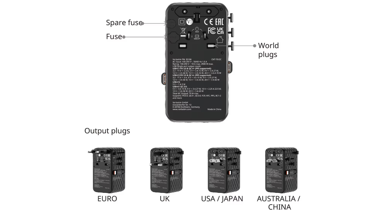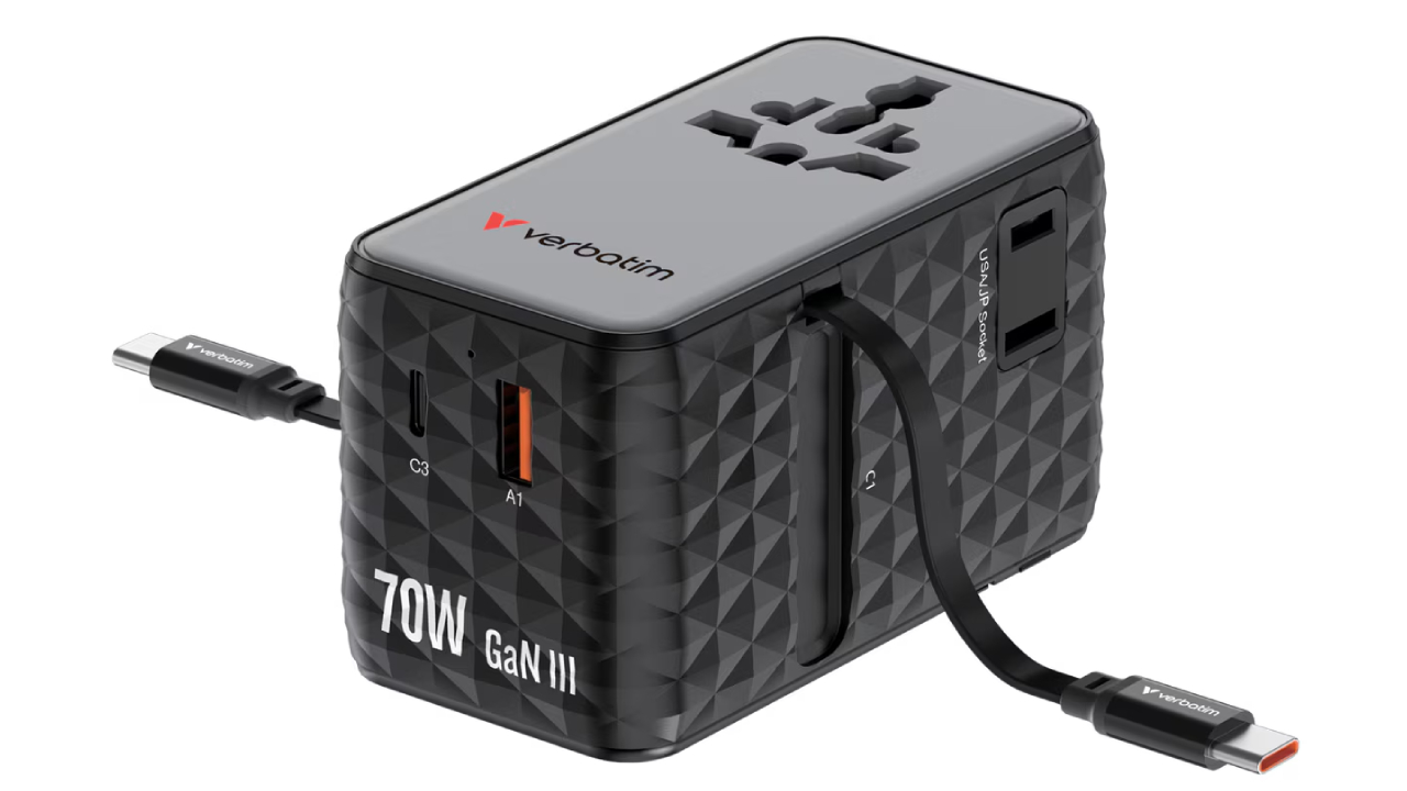 Verbatim Charger Travel 70w 2c Retractable Universal Travel Adapter Black