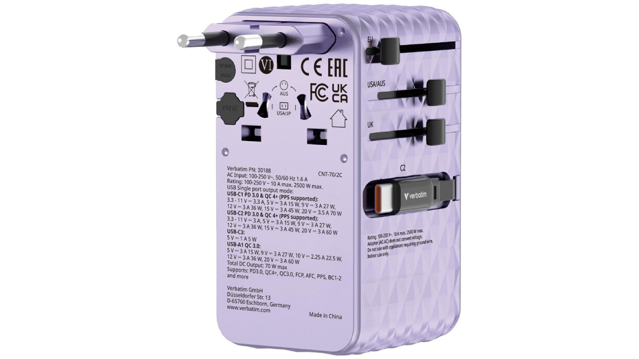 - Prize la care se poate conecta adaptorul de călătorie: Tip A, Tip B, Tip C, Tip D, Tip E, Tip F, Tip G, Tip H, Tip I, Tip J, Tip K, Tip L, Tip N, Tip O