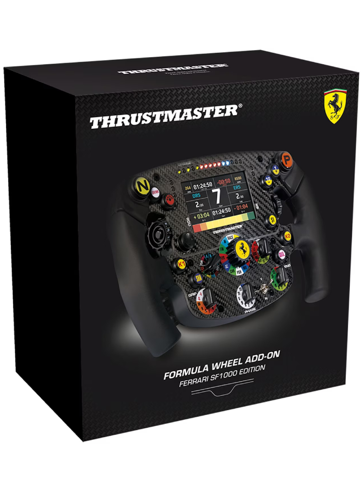Thrustmaster Formula Wheel Add-On Ferrari SF1000 Edition dispune de eticheta iconică și marcajele oficiale regăsite pe volanul real, precum și de un afișaj IPS LCD de 4,3 inci (109 mm) care afișează până la 69 de elemente de informații despre curse.