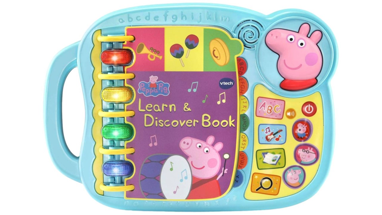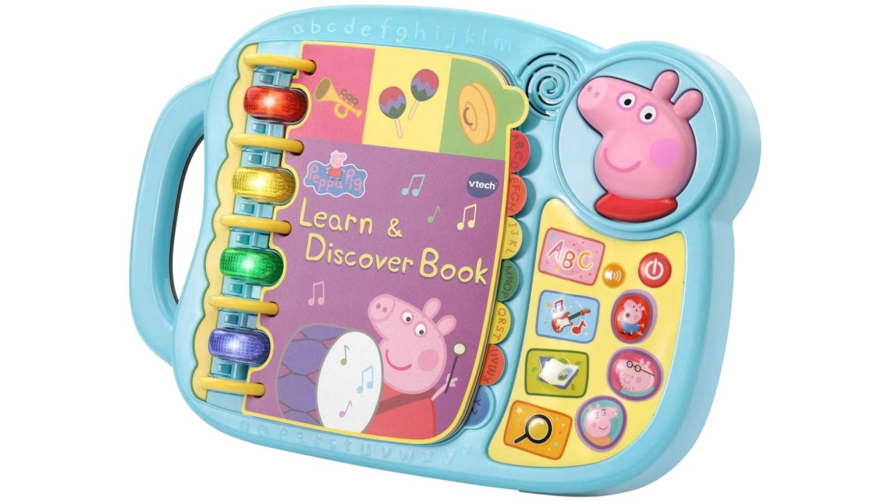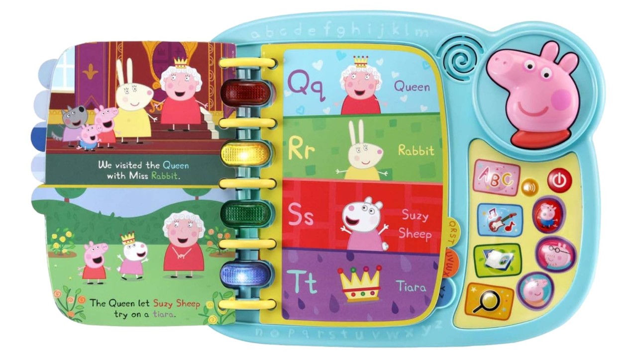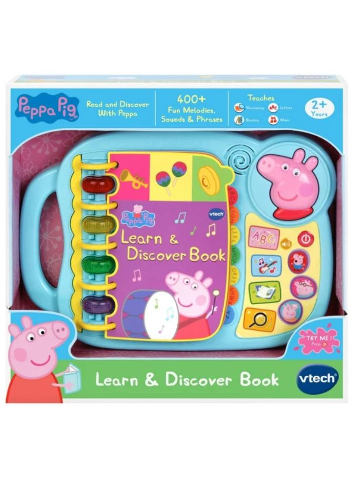 Peppa Pig vorbește despre ziua ei cu familia și prietenii în cartea Peppa Pig Learn & Discover Book.