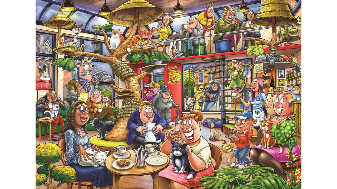 În acest puzzle, ești transportat într-o cafenea cu pisici plină de viață, unde clienții sorb cafea și se relaxează alături de companionii lor blănoși.