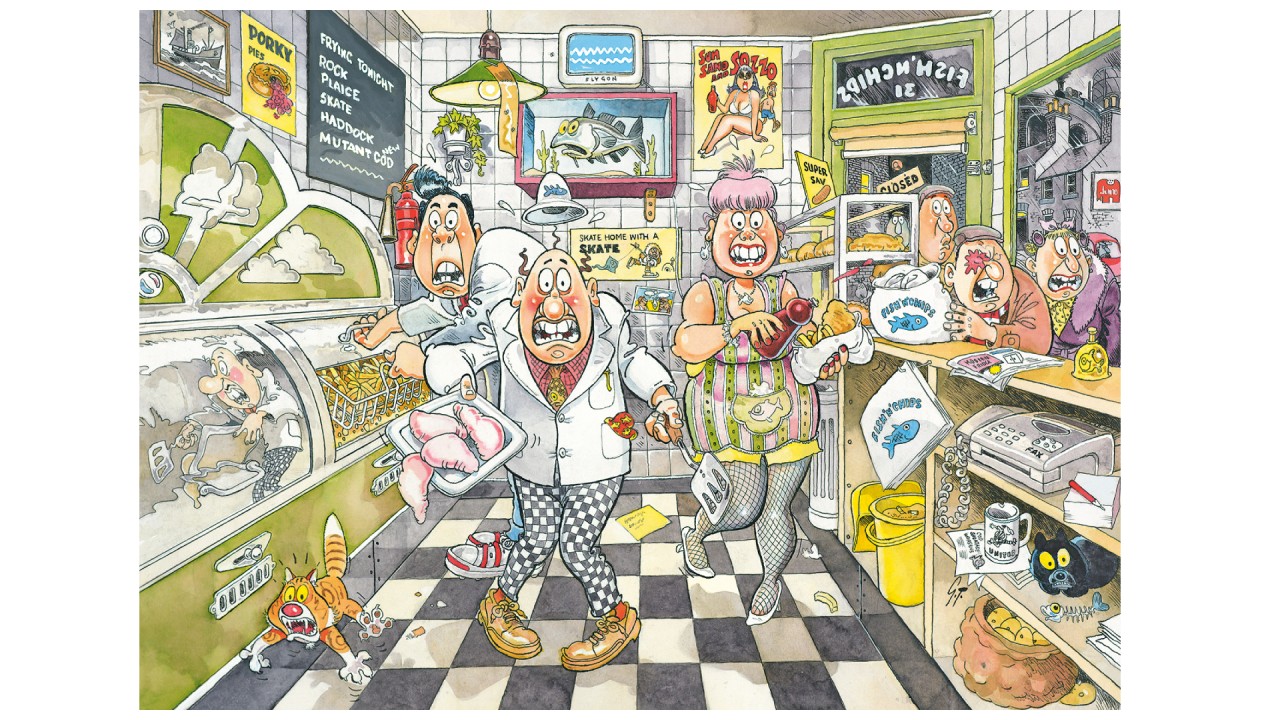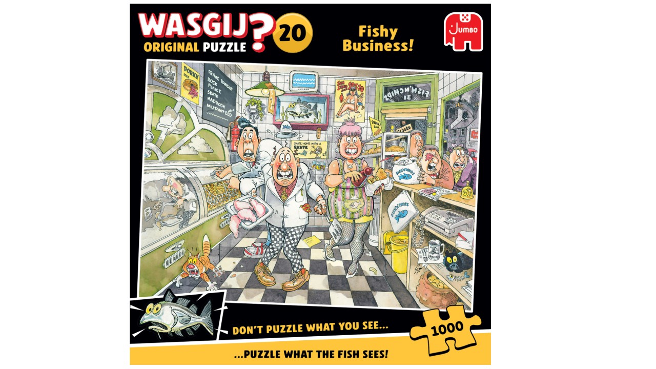 Acest puzzle Wasgij Original 20, cu tema „Fishy Business” (Afaceri cu pește), include 1000 de piese și creează o imagine bidimensională interesantă.