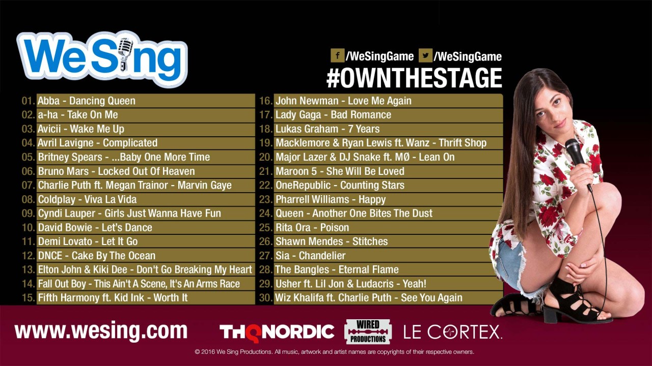 Incluzând 26 de hituri internaționale numărul unu care acoperă cinci decenii, fiecare piesă a fost aleasă cu grijă de echipa We Sing Productions cu scopul de a atrage jucătorii din întreaga lume, incluzând exclusivități disponibile doar în We Sing.
