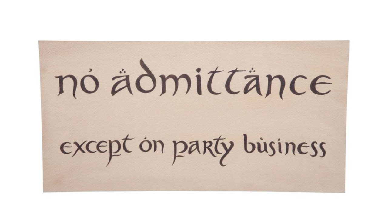 Din ce în ce mai iritat de atenția atrasă de sărbătorirea celei de-a 111-a aniversări, Bilbo Baggins este nevoit să ia măsuri drastice (în termeni hobbiți) și îi cere lui Frodo să atârne un semn pe poartă: „Accesul interzis, cu excepția celor implicați în petrecere”.