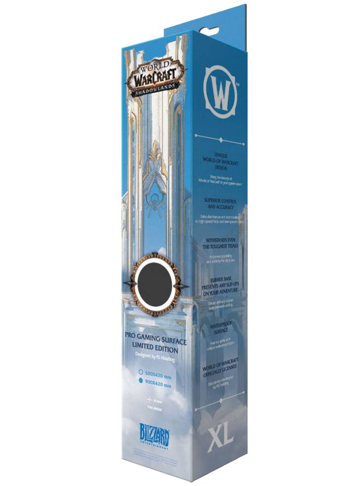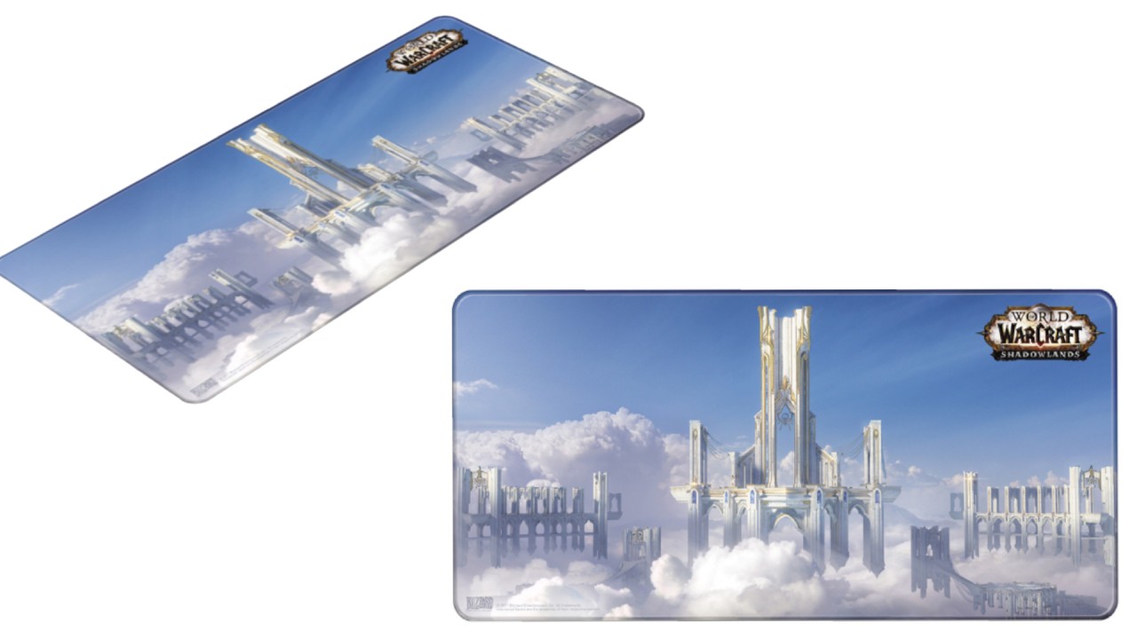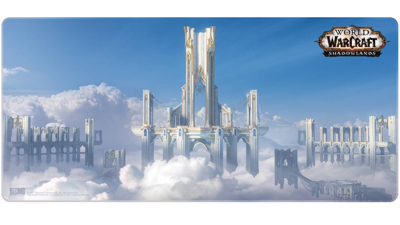 O ilustrare detaliată a magnificei fortărețe zburătoare cu arhitectura sa frumoasă - acest lucru este prezentat pe imprimeul color care împodobește întreaga suprafață superioară a padului World of Warcraft Shadowlands: Bastion XL.