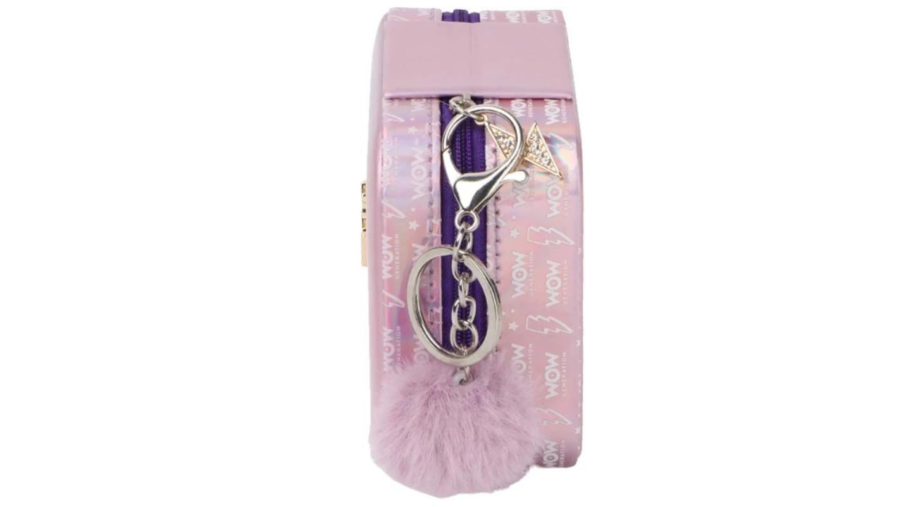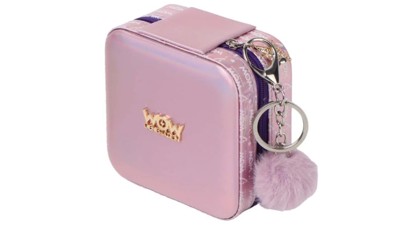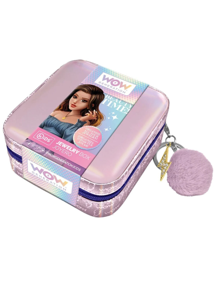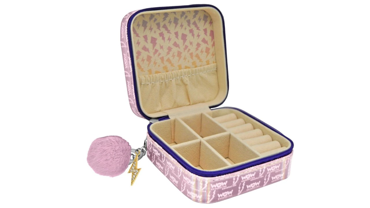 Cutia pentru bijuterii are o închidere cu fermoar și un pompon cu un charm cu sclipici WOW Generation ca element decorativ.