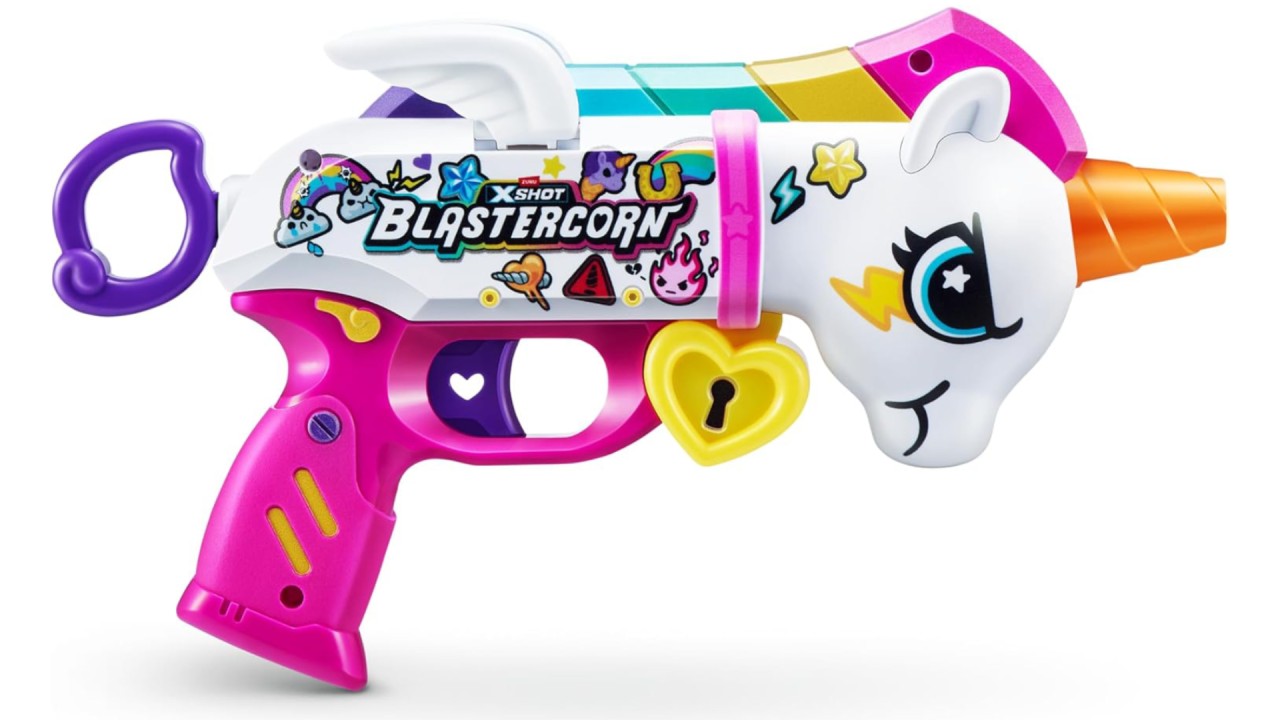 XSHOT Blastercorn vine într-o culoare cu tematică de unicorn, adăugând farmec și fantezie aventurilor tale cu explozii.