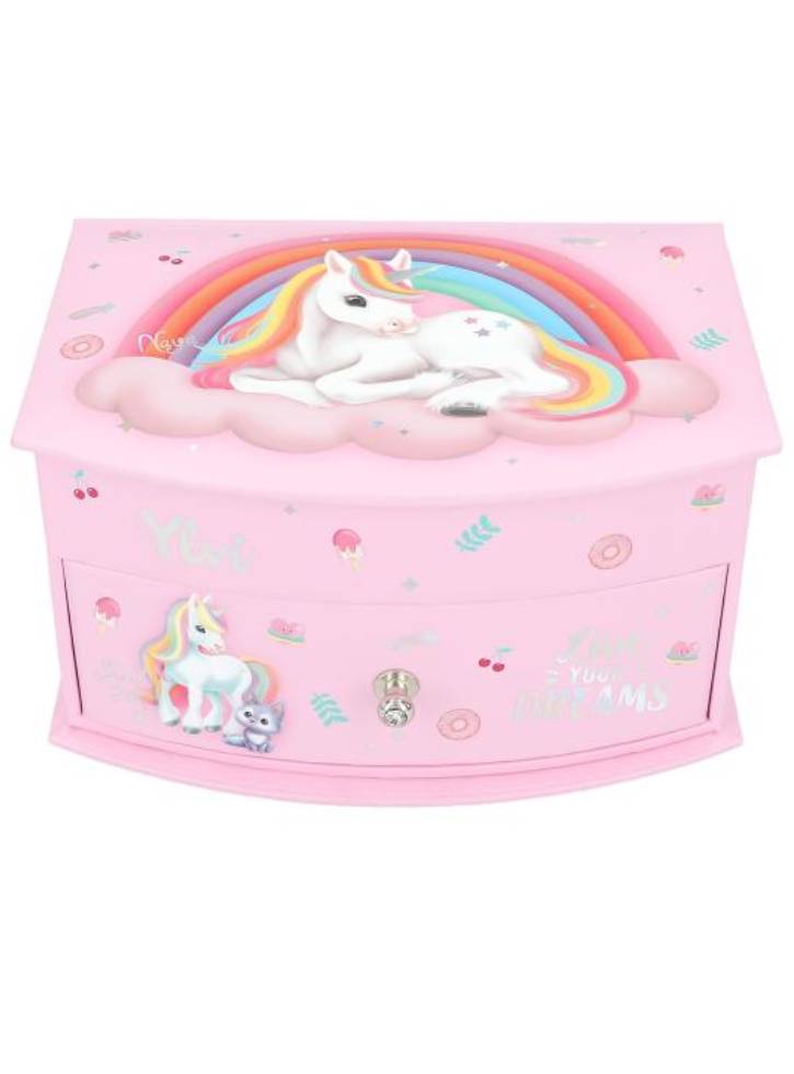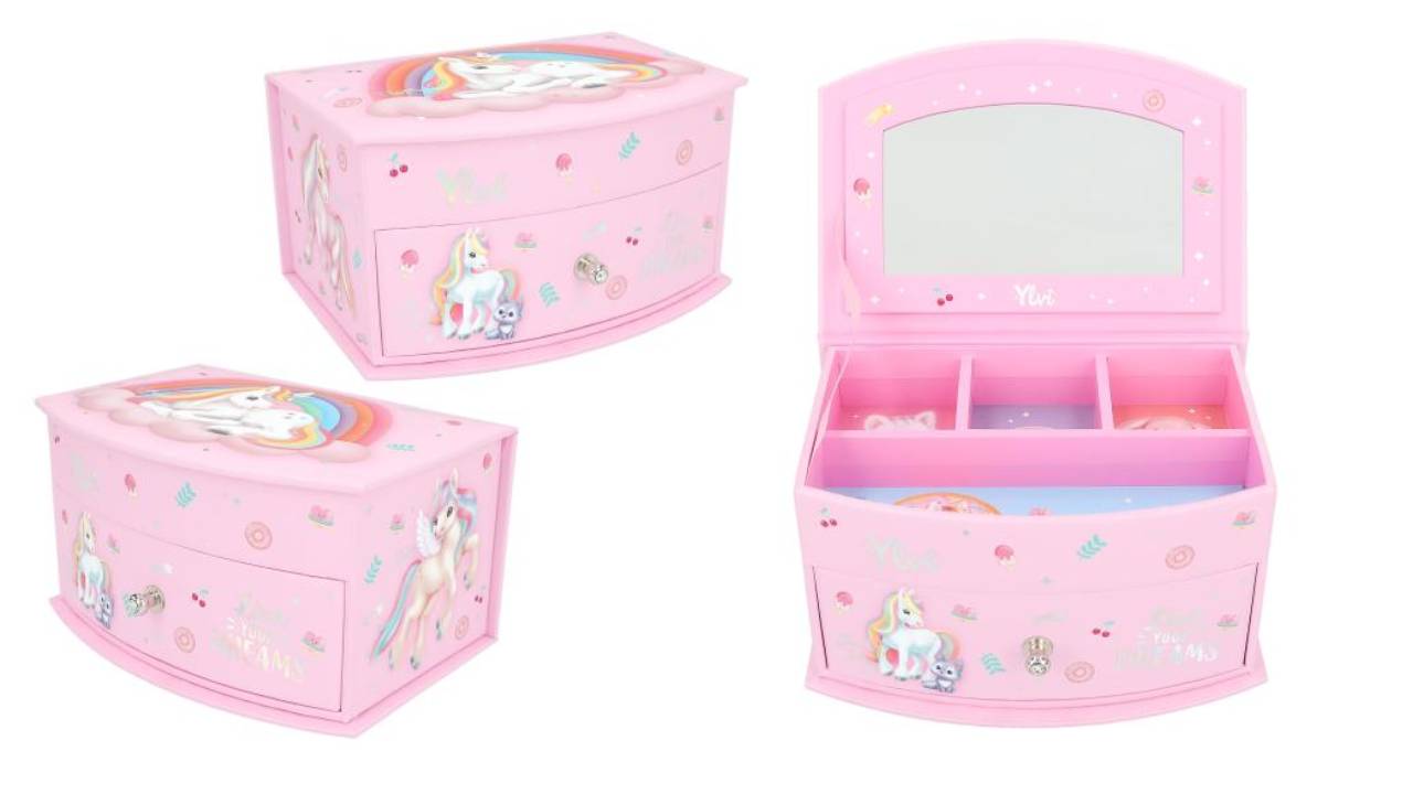 Mica cutie de bijuterii roz de la Ylvi cu motive grozave de unicorni si simpaticii lor prieteni animale are un capac rabatabil cu o oglinda in interior si un sertar cu strasuri pe buton.