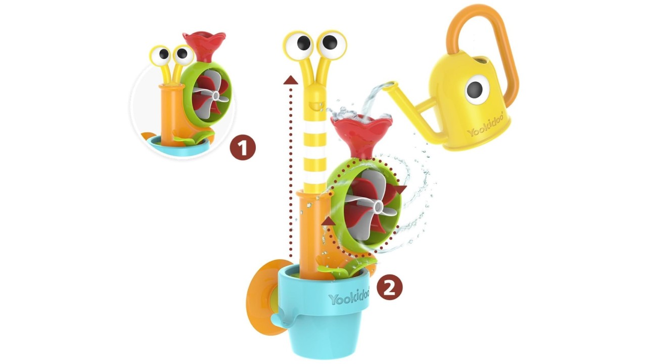 Water the flower on the snail's shell, watch its head rise and the propeller spin. Includes a sprayer and a bathtub attachment.