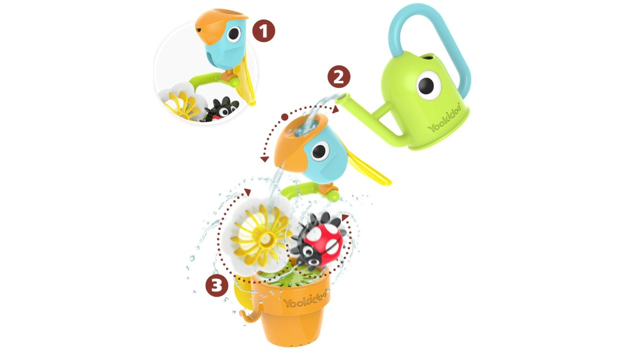 O jucărie pentru baie cu tematică de grădină, un ghiveci cu o pasăre care se răstoarnă, o floare care se învârte și o buburuză. Include și o stropitoare care poate fi folosită pentru a uda pasărea din vârful ghiveciului și a declanșa o reacție în lanț de distracție!